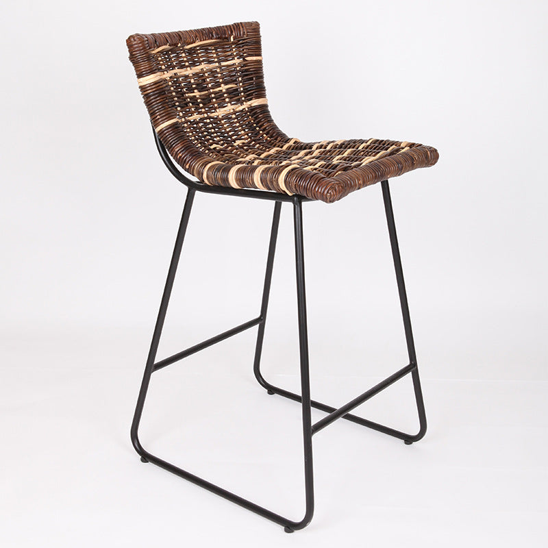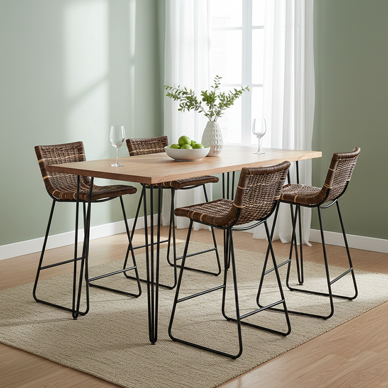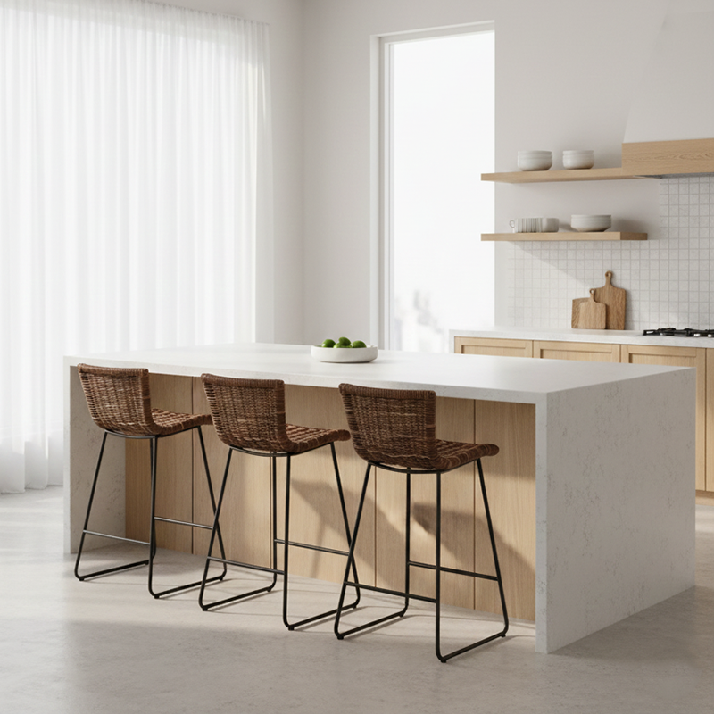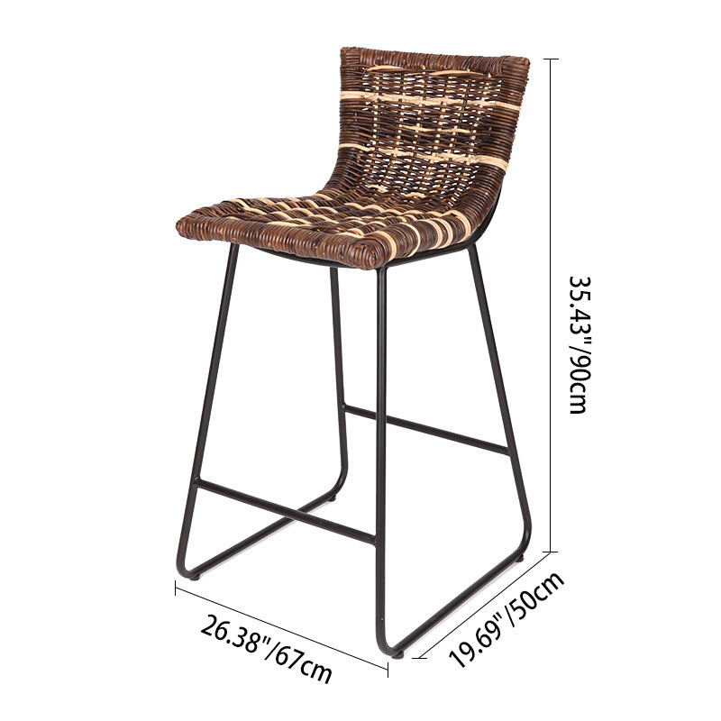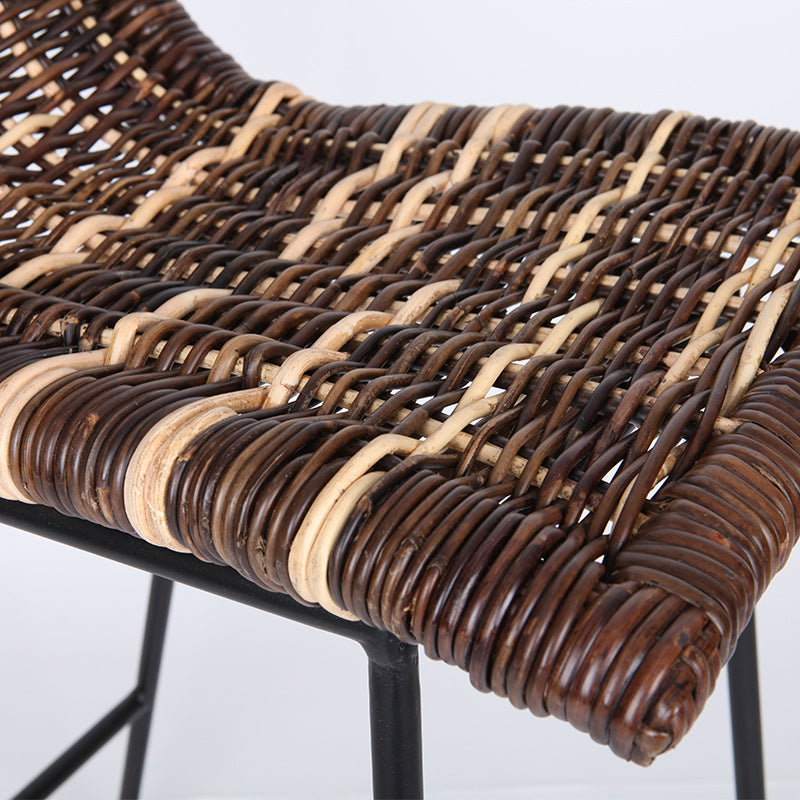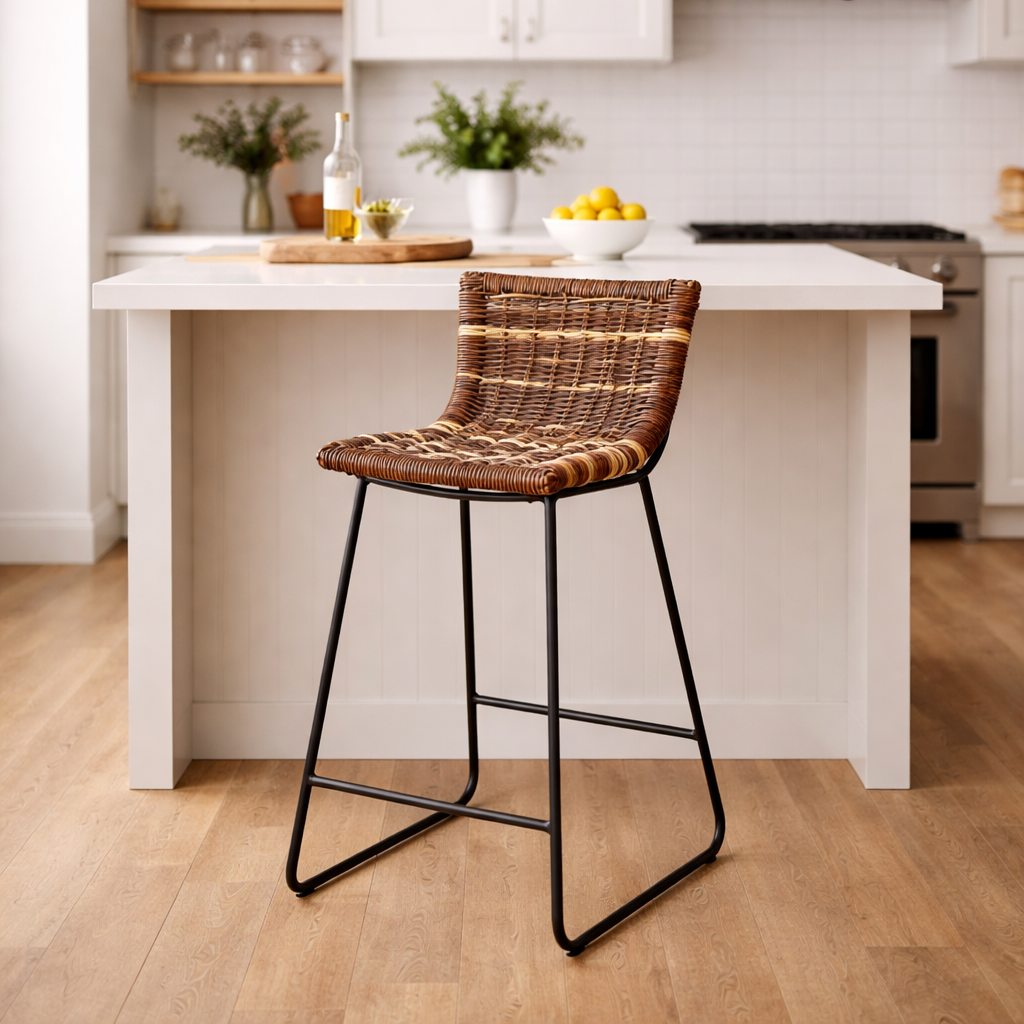 This farmhouse bar stool is a study in gentle contrast: its body, hand-woven from Indonesian rattan, is soft to the touch---light, pliable, yet stubbornly resistant to cracking, even after years of use. Its legs, sharp black iron, cut a sturdy line: they hold fast when you lean in to pass a plate, when kids perch on the edge mid-snack, turning "flimsy wicker" into "reliable core." The rattan does more than look good: it drinks in kitchen humidity, keeping the seat cool when the stove's on and the air thickens. Brown rattan and black metal blend like wheat fields and storm clouds---warm, grounded, and unapologetically farmhouse.