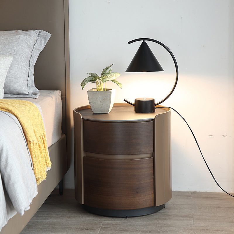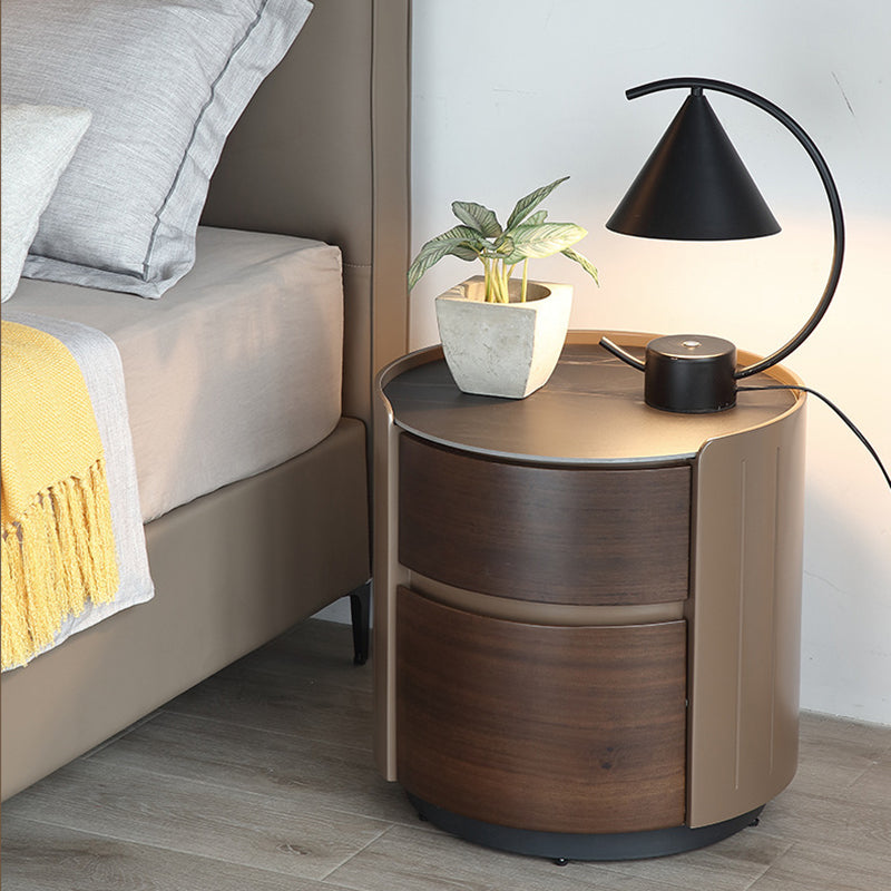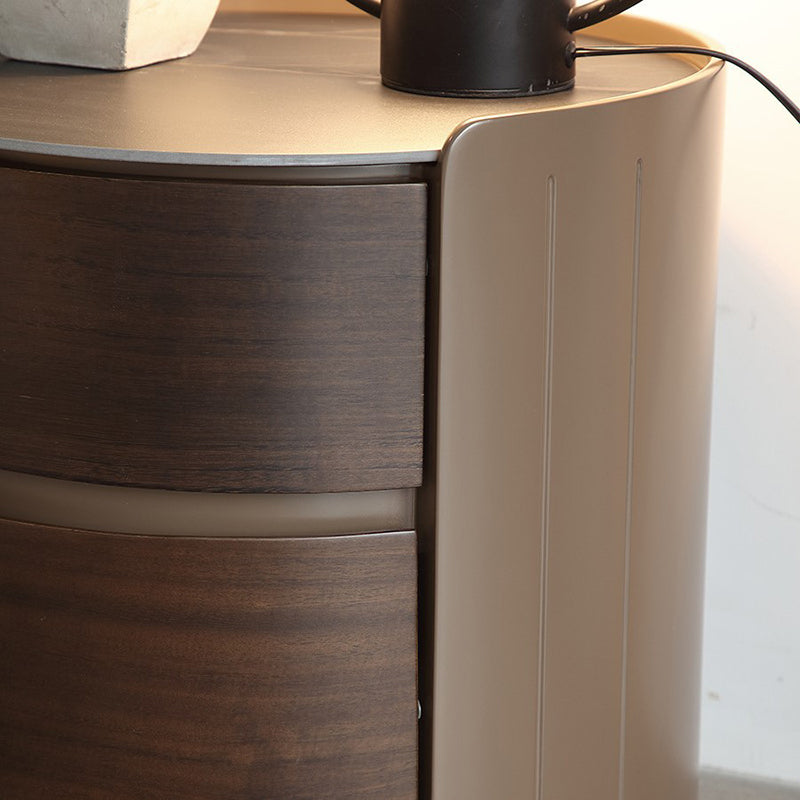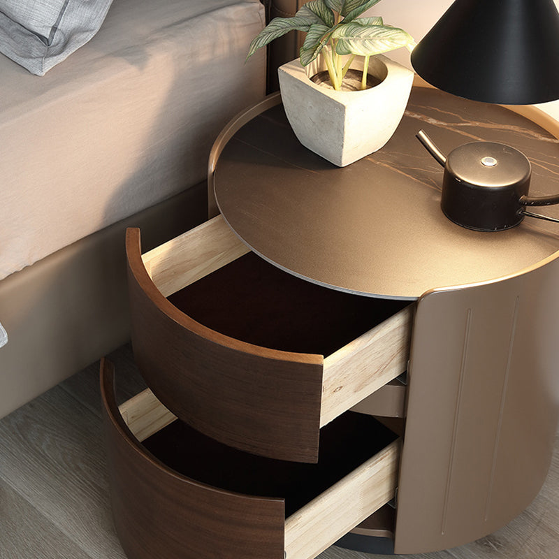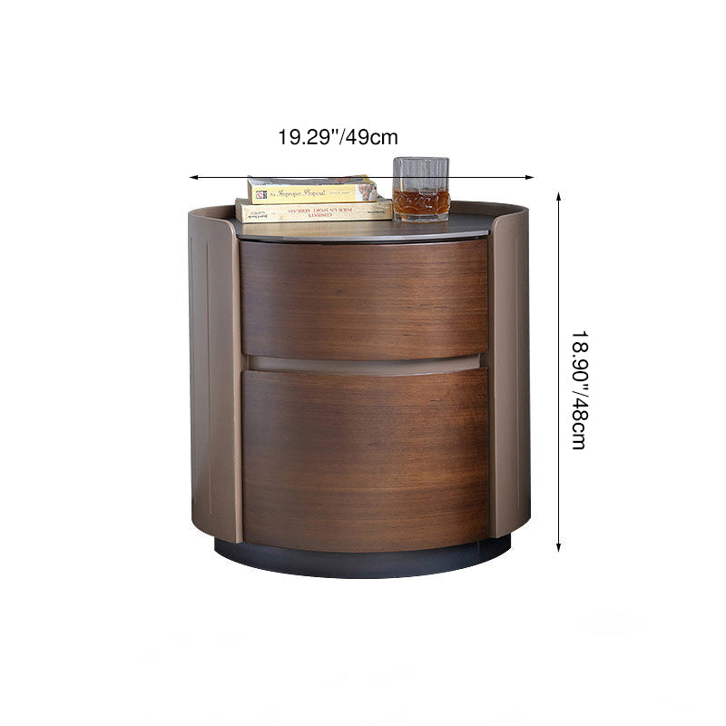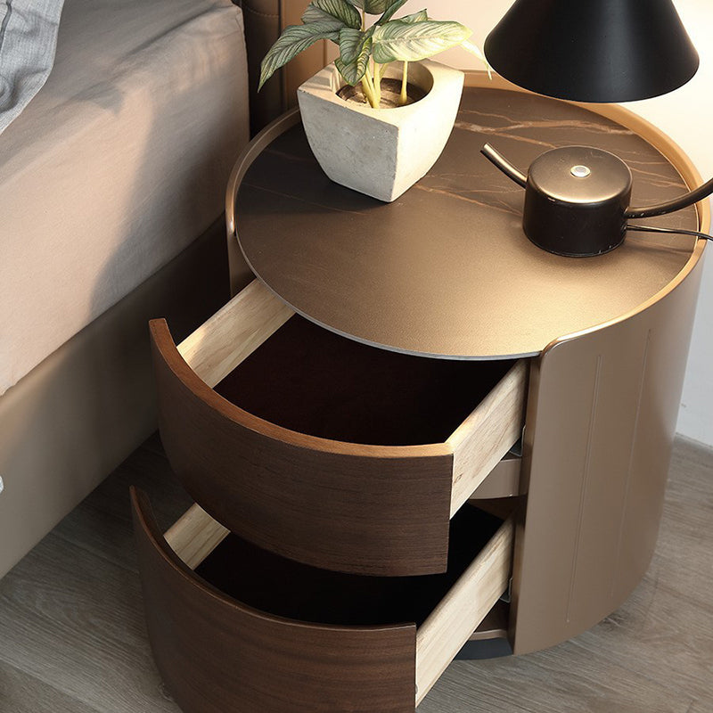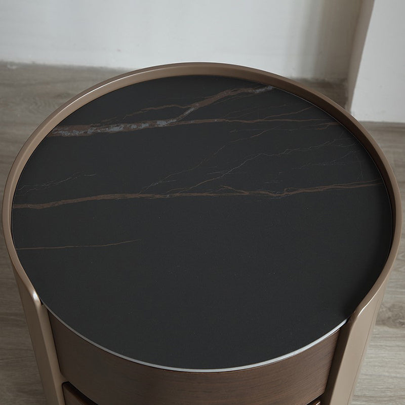 This modern luxury round nightstand features a solid wood structure with a premium stone top and two smooth-glide drawers, offering elegant bedside storage for contemporary bedrooms.