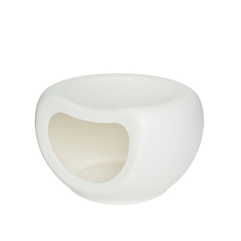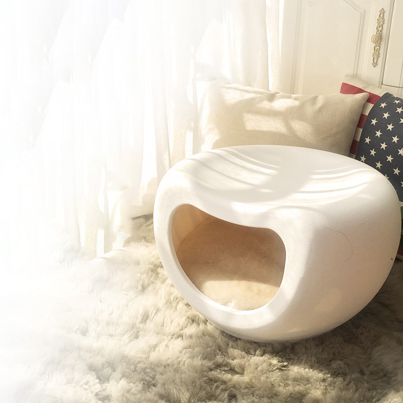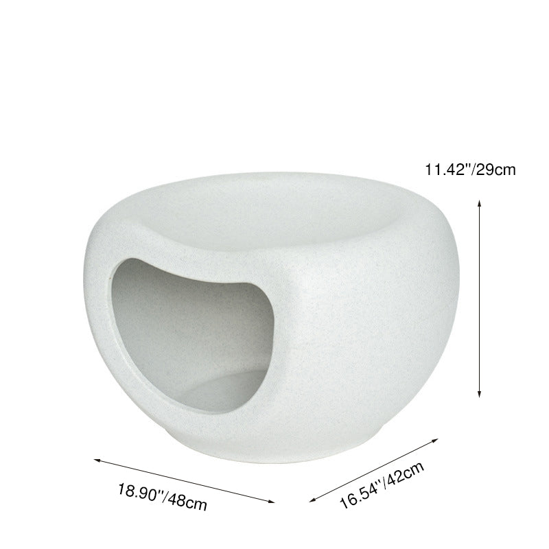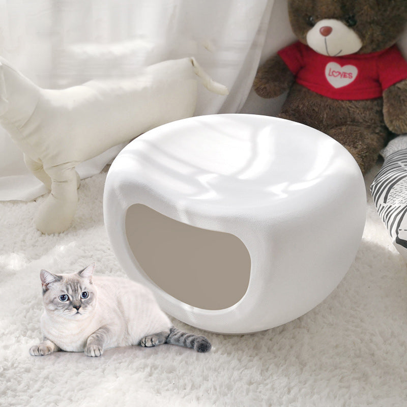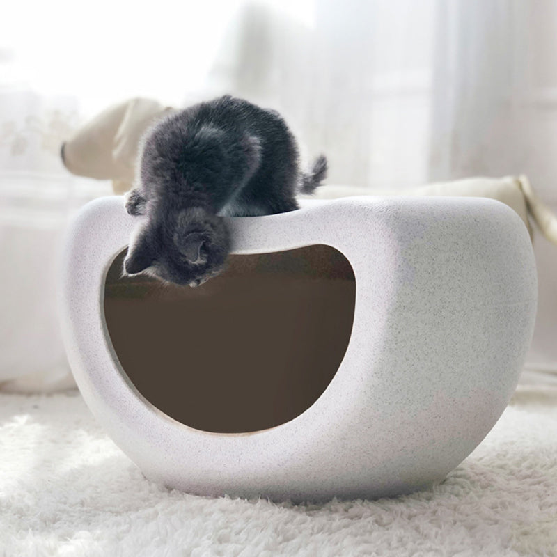 This washable crescent-shaped cat bed is made from durable PE plastic with a matte finish for long-lasting, chew-resistant use. Designed with a single-entry enclosed space in white and gray, it provides cozy comfort while fitting seamlessly into modern living rooms.