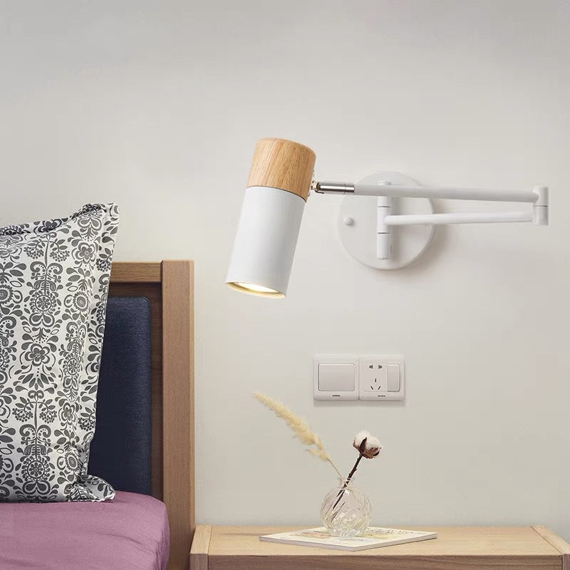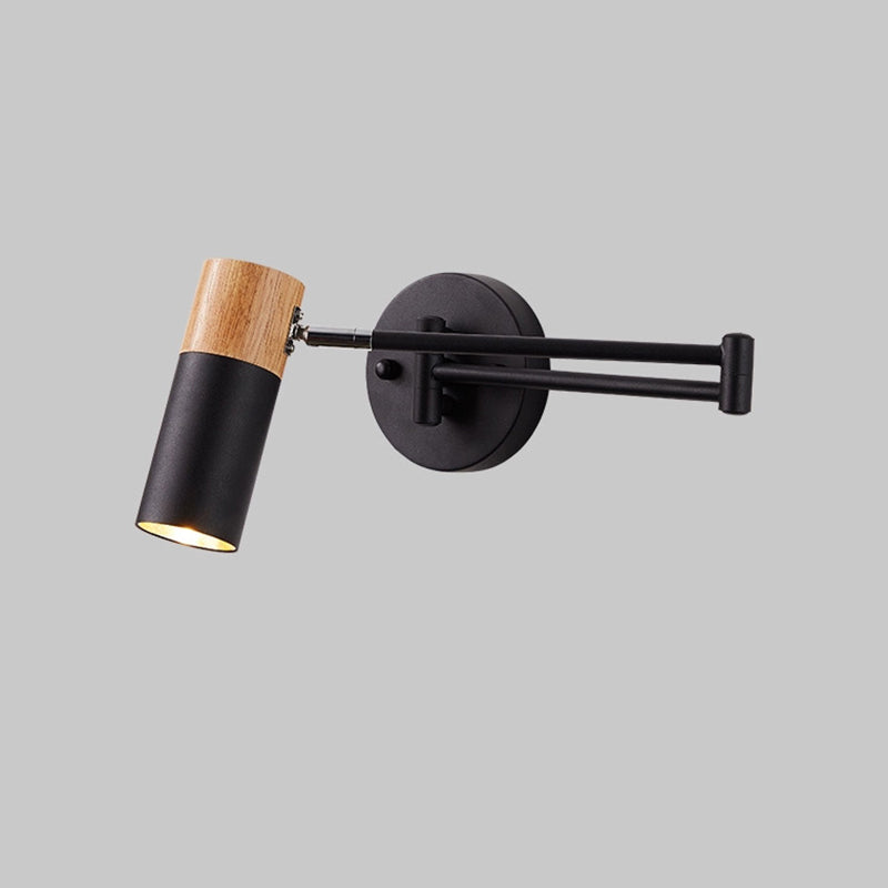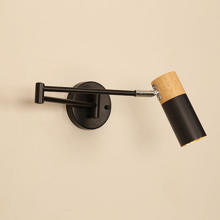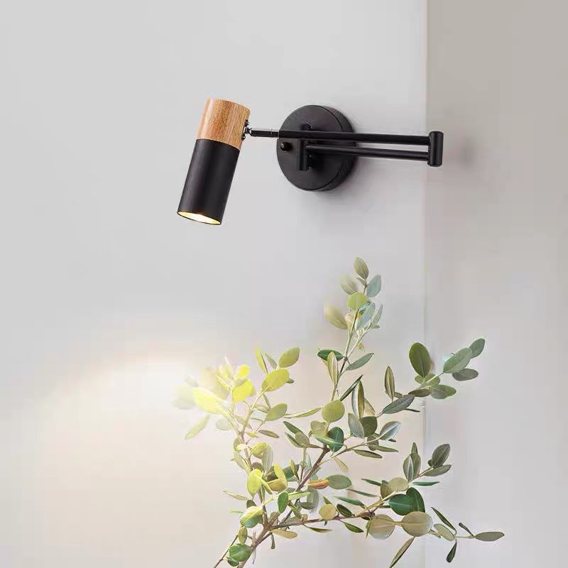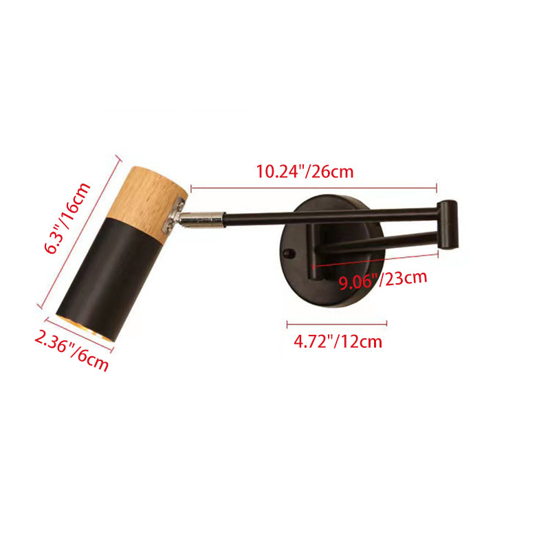 This modern minimalist wall sconce combines iron craftsmanship with natural wood accents and features a clean cylindrical design. The adjustable swing arm and rotatable lamp head provide flexible lighting for bedrooms, living rooms, or entryways, making it perfect for reading or ambient illumination. A stylish, functional 1-light wall lamp that enhances any contemporary space.