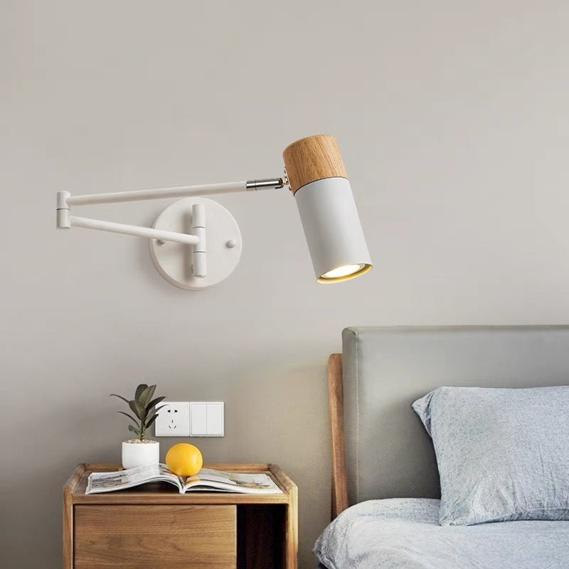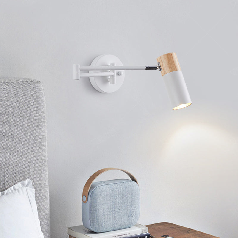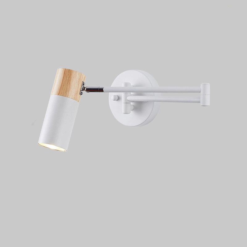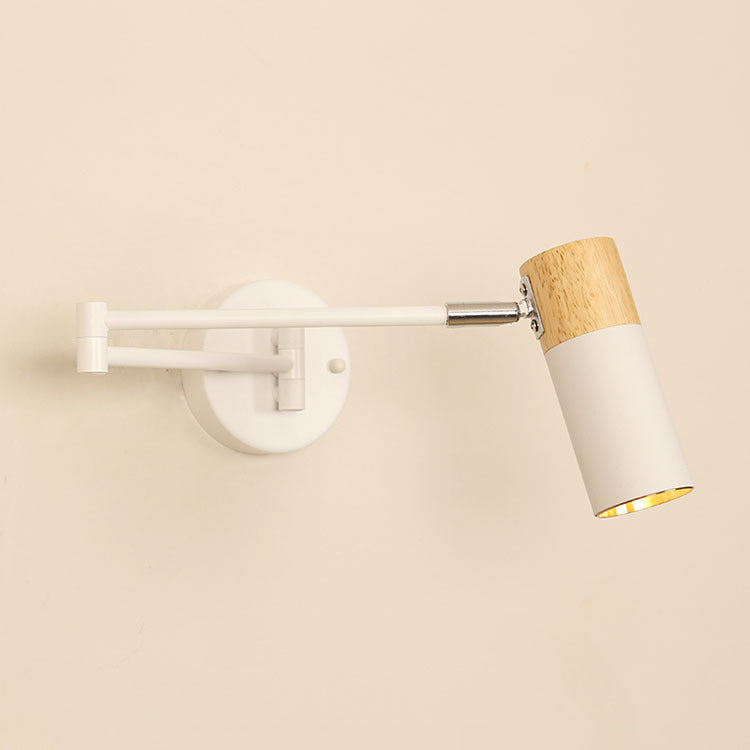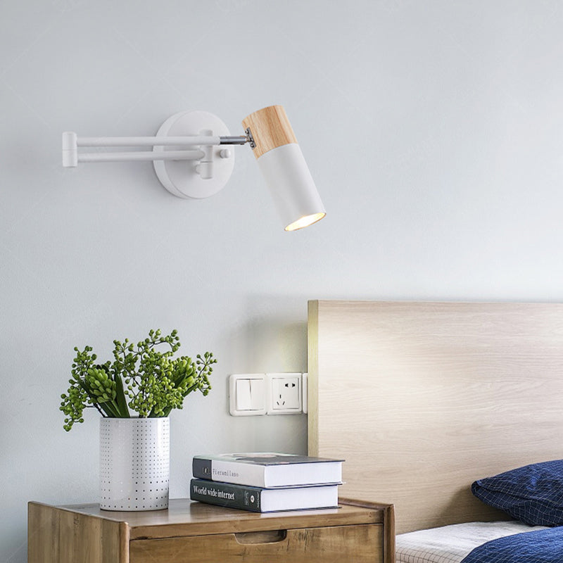 This modern minimalist wall sconce combines iron craftsmanship with natural wood accents and features a clean cylindrical design. The adjustable swing arm and rotatable lamp head provide flexible lighting for bedrooms, living rooms, or entryways, making it perfect for reading or ambient illumination. A stylish, functional 1-light wall lamp that enhances any contemporary space.