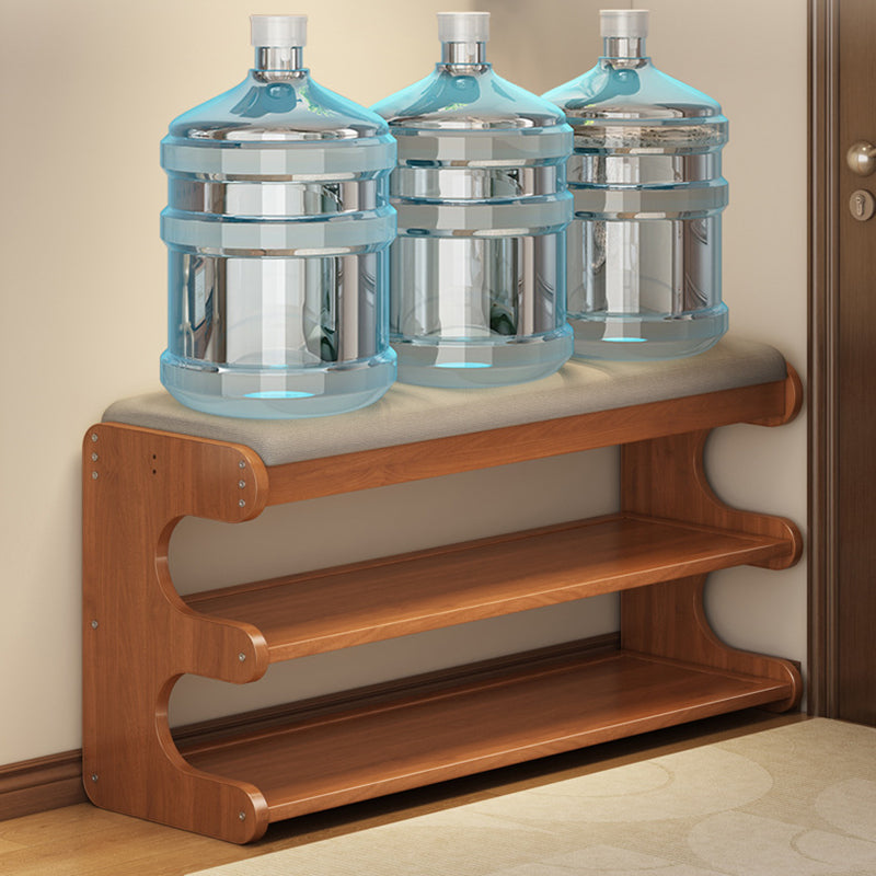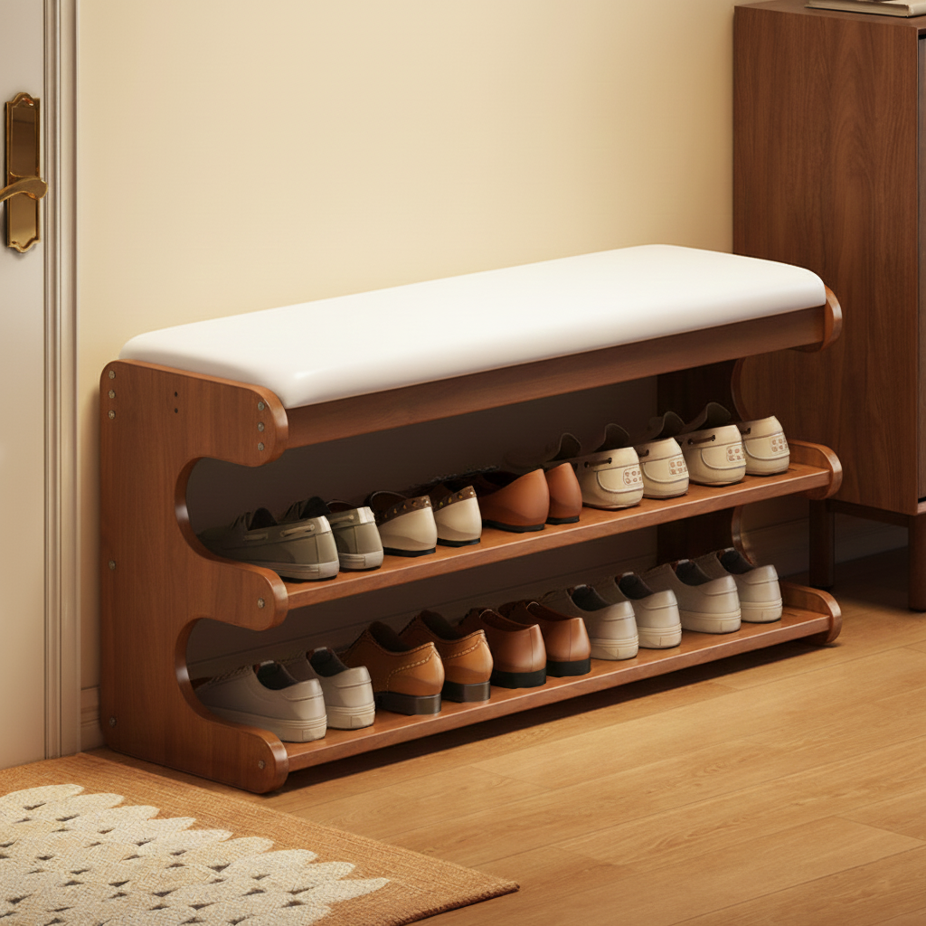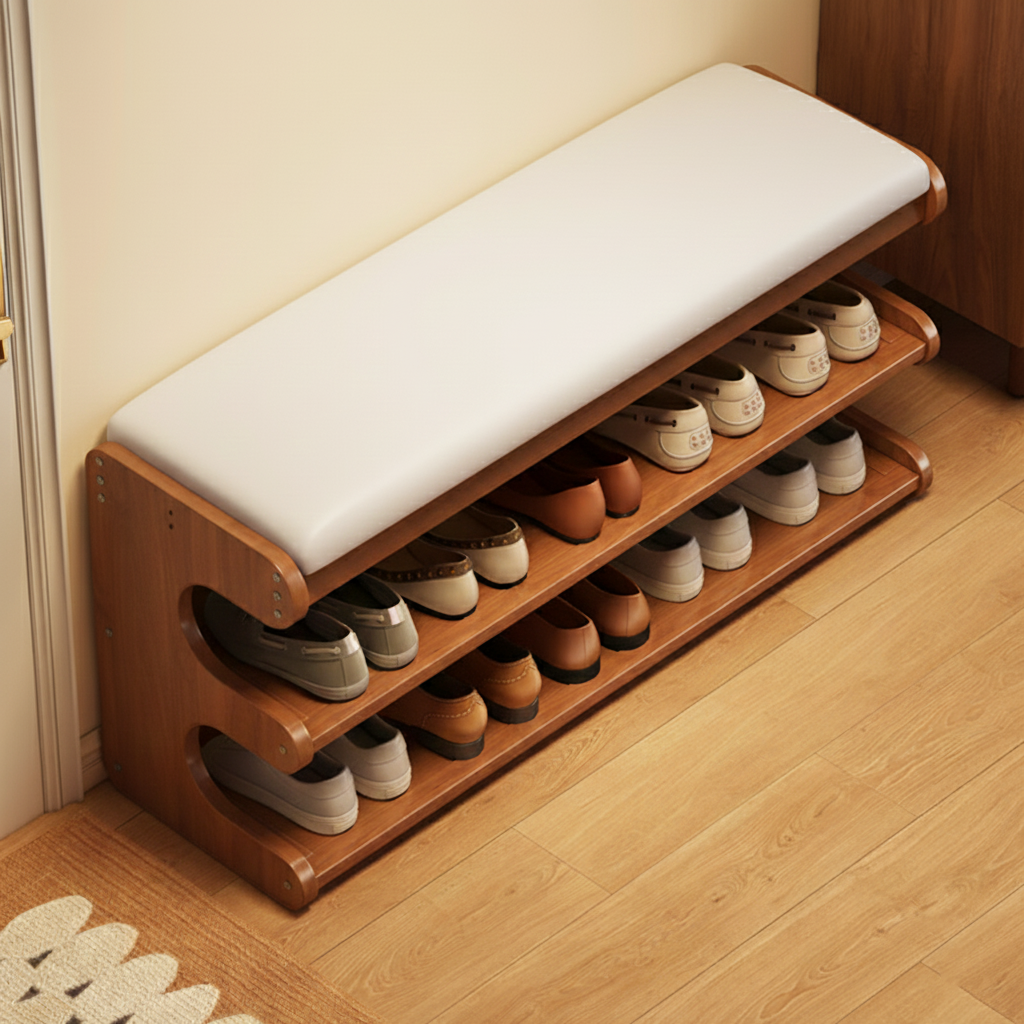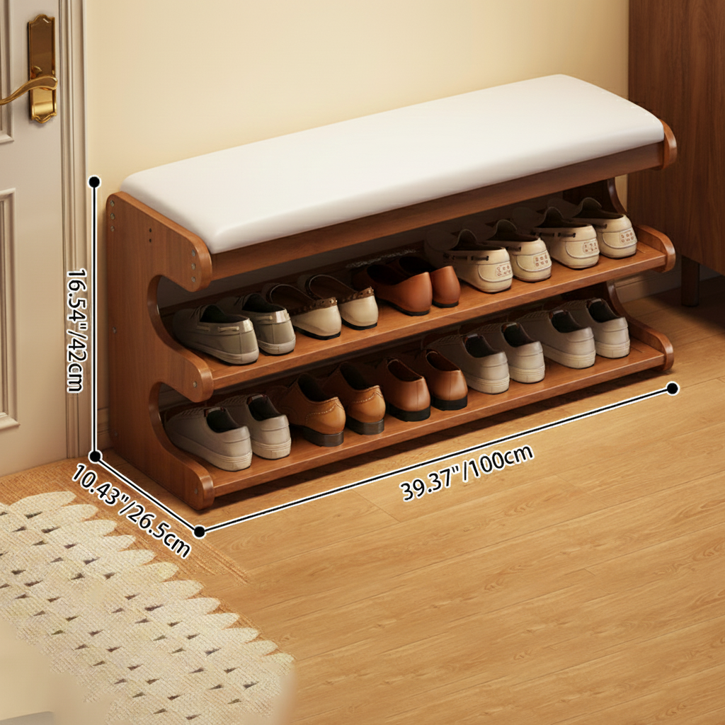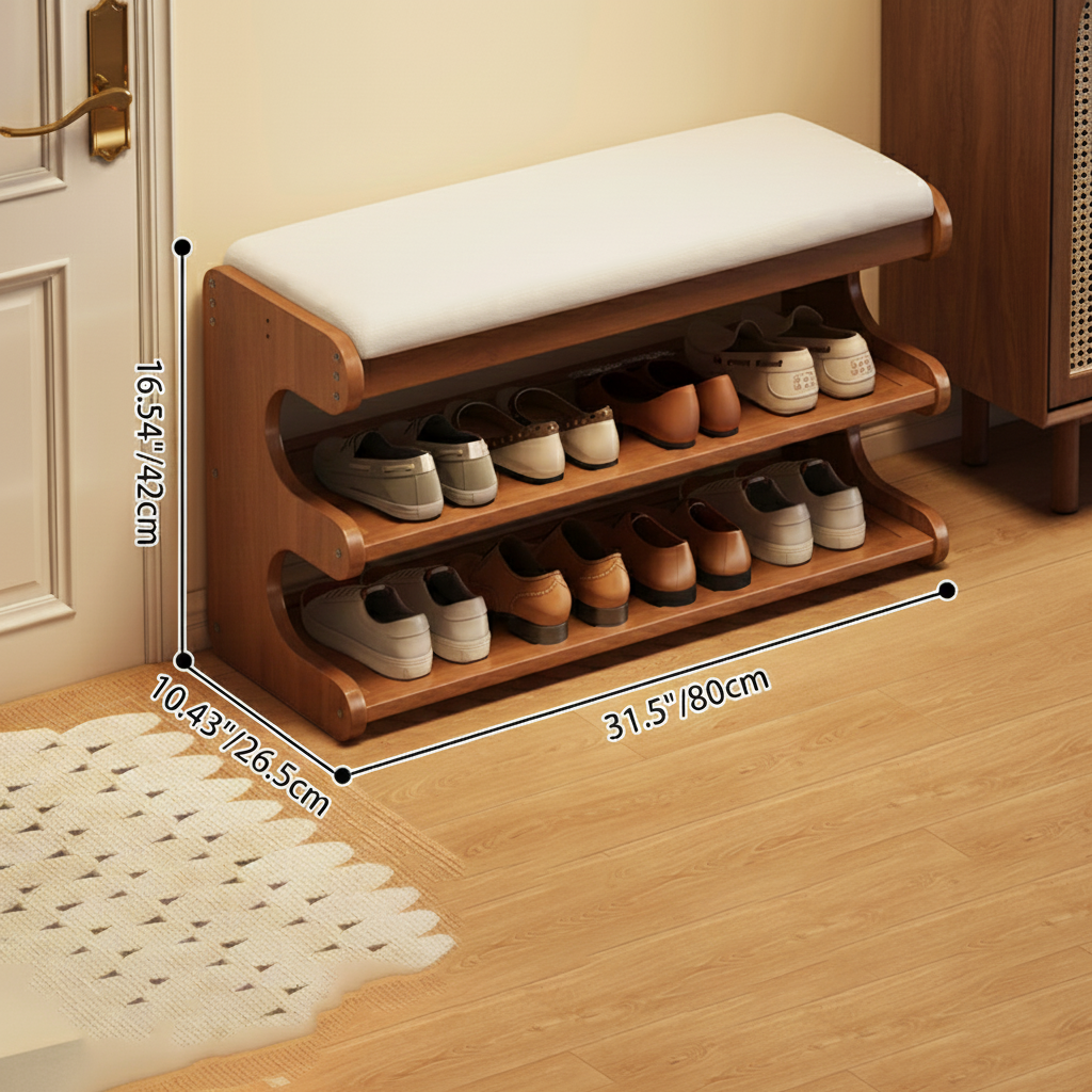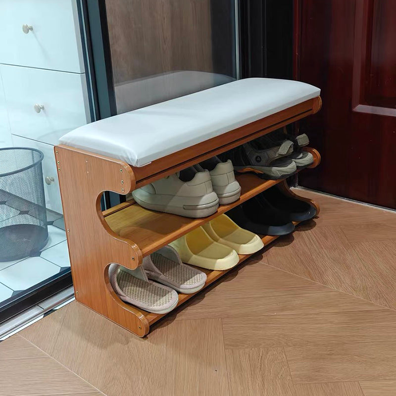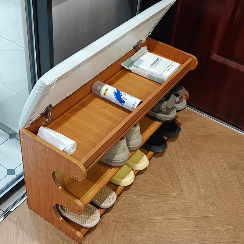 This modern minimalist shoe bench features a solid pine wood and bamboo structure with a rectangular silhouette, offering 2-tier storage and one hidden compartment for everyday organization. Finished in a natural wood tone, it combines seating and shoe storage in one compact design—ideal for entryways and small spaces.