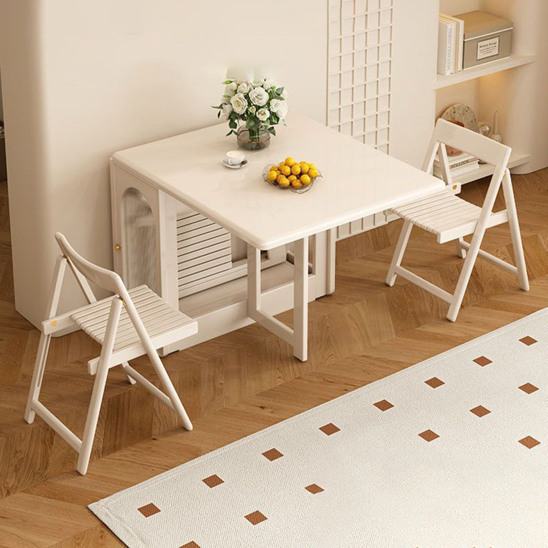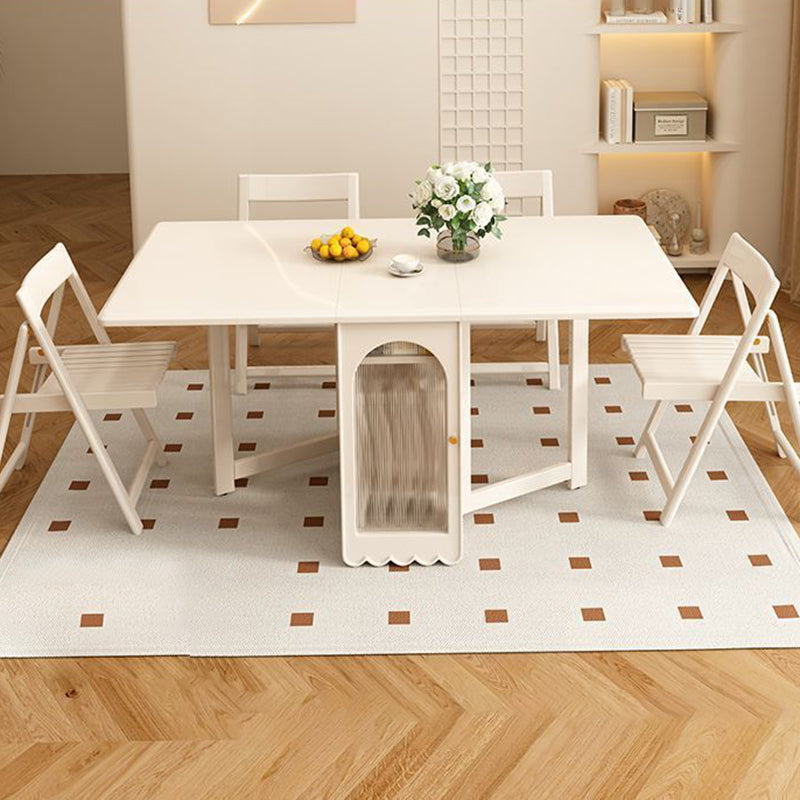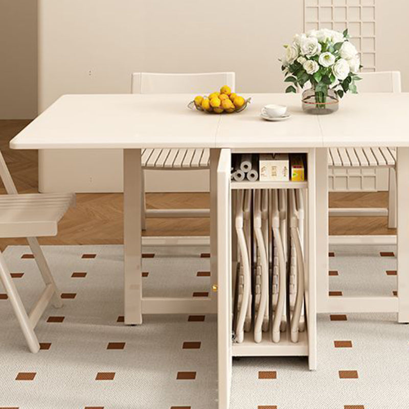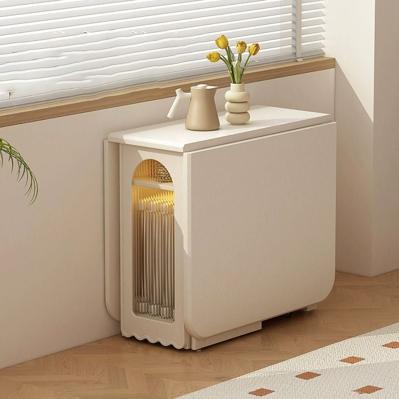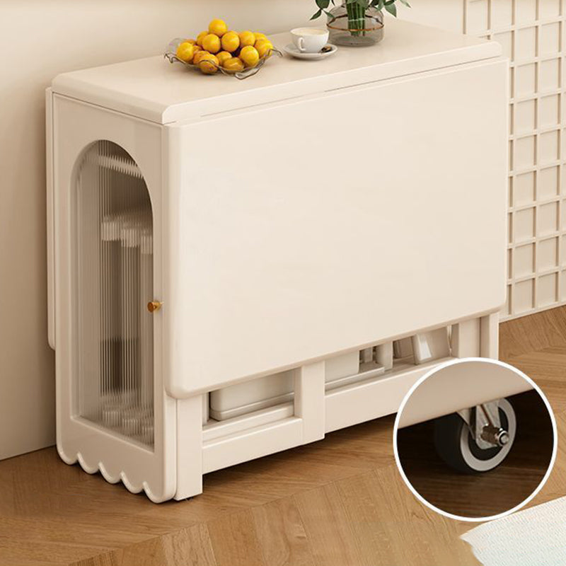 Ideal for modern dining spaces, this foldable dining table combines elegant design with clever functionality. It features a stable, durable rectangular construction using a blend of solid wood and glass, finished in a refined cream white. When fully extended, it offers ample dining space, yet its foldable design and dual built-in storage cabinets ensure maximized functionality and significant space-saving capability.