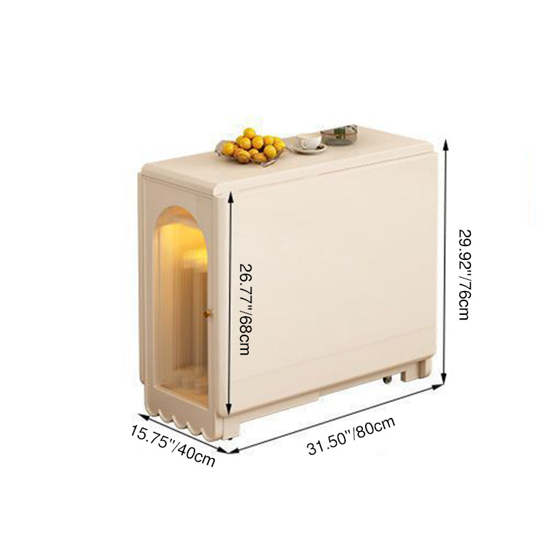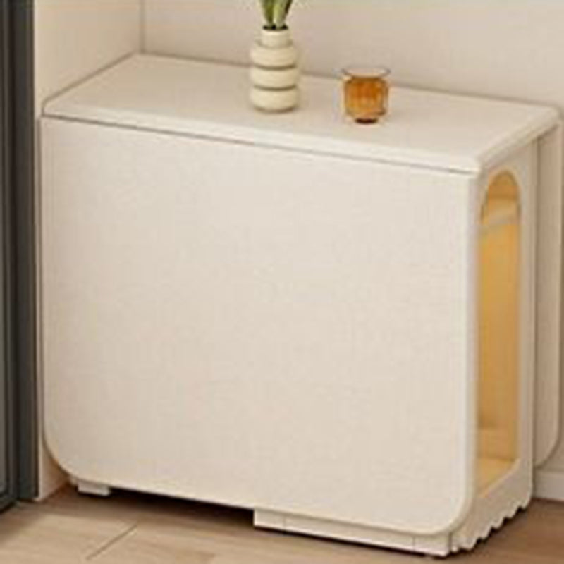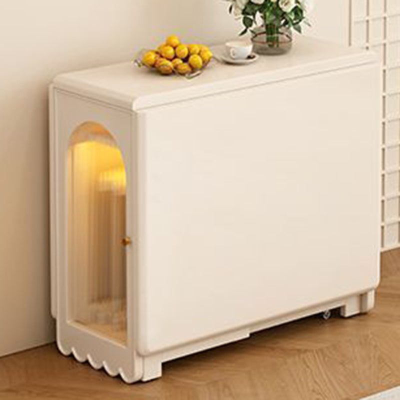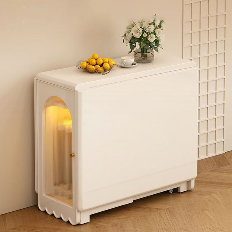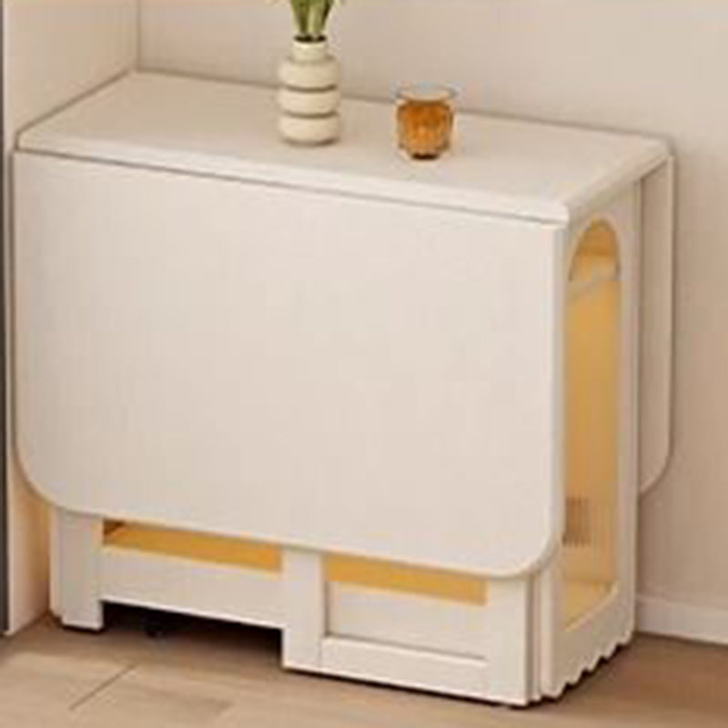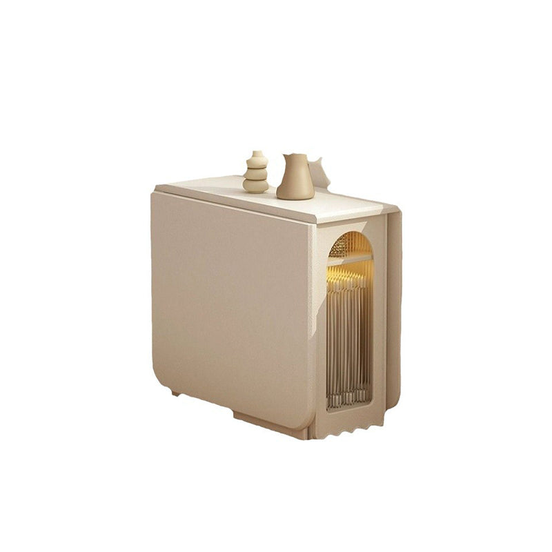 Ideal for modern dining spaces, this foldable dining table combines elegant design with clever functionality. It features a stable, durable rectangular construction using a blend of solid wood and glass, finished in a refined cream white. When fully extended, it offers ample dining space, yet its foldable design and dual built-in storage cabinets ensure maximized functionality and significant space-saving capability.