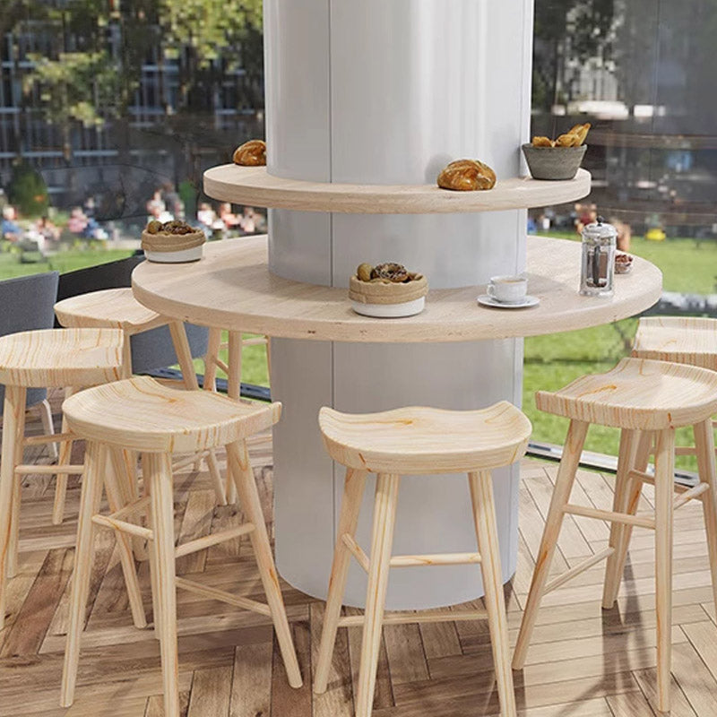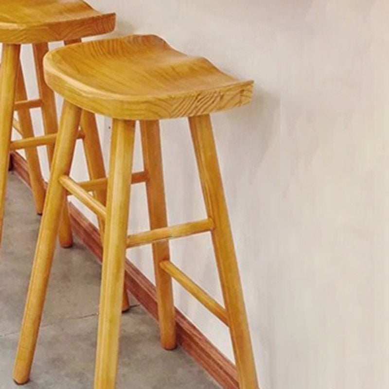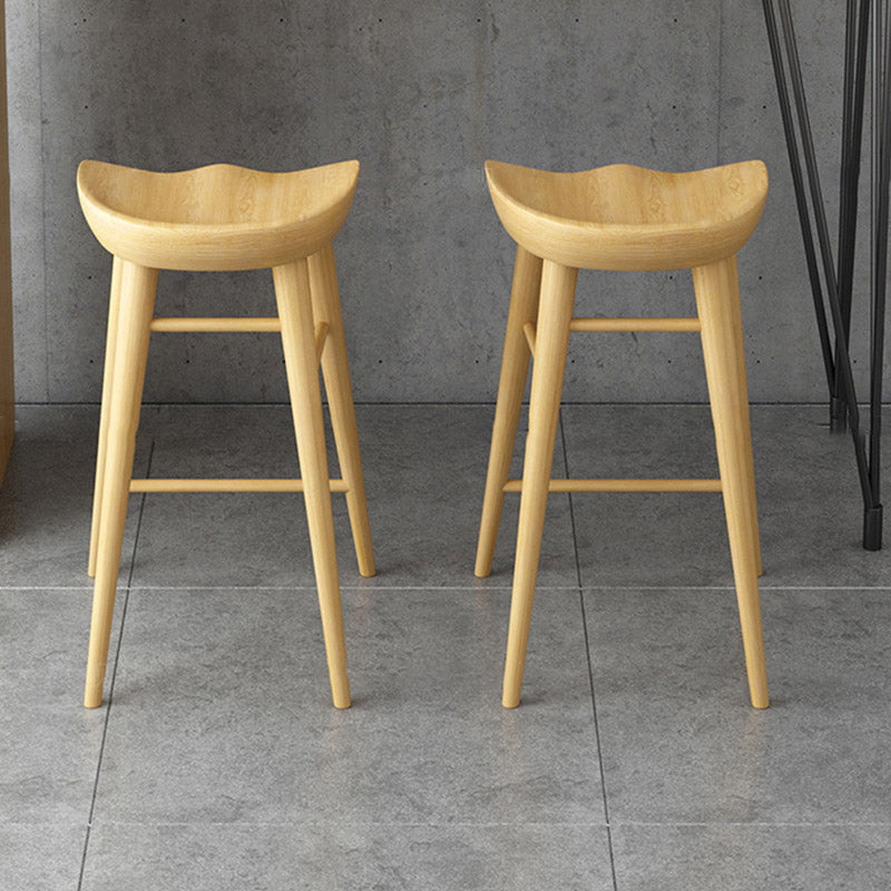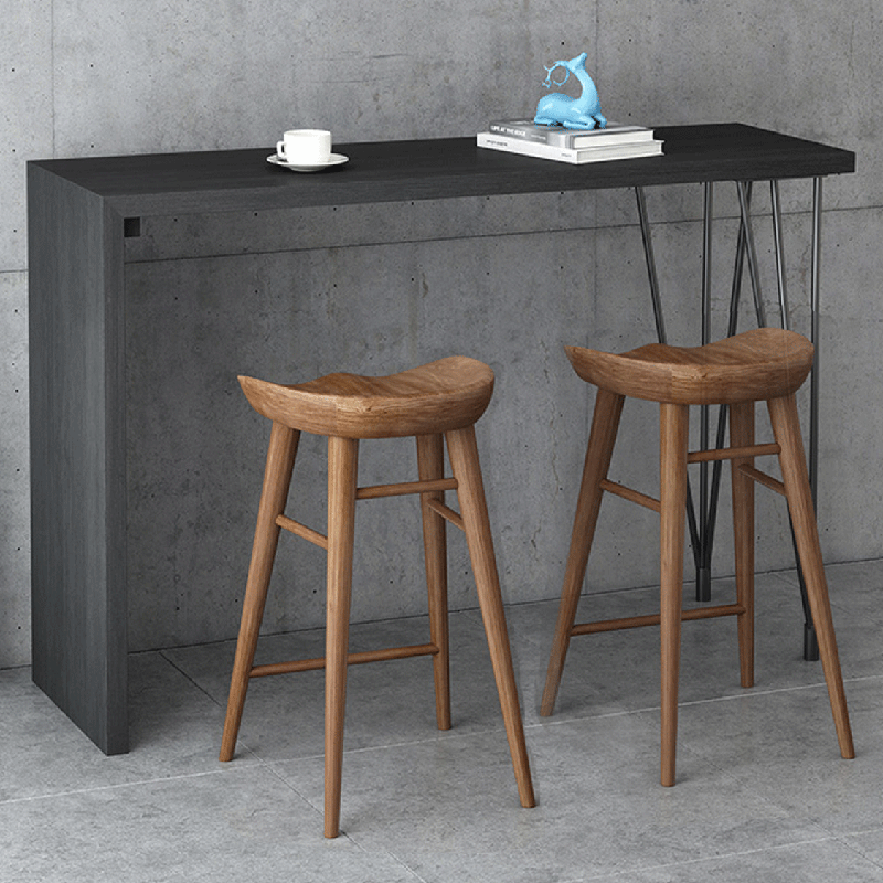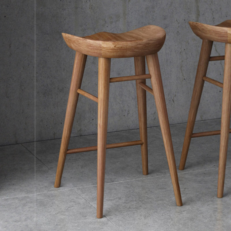 This modern minimalist solid wood bar stool features an ergonomic contoured seat that comfortably supports the body, paired with a built-in footrest for relaxed seating at kitchen islands or bar counters.