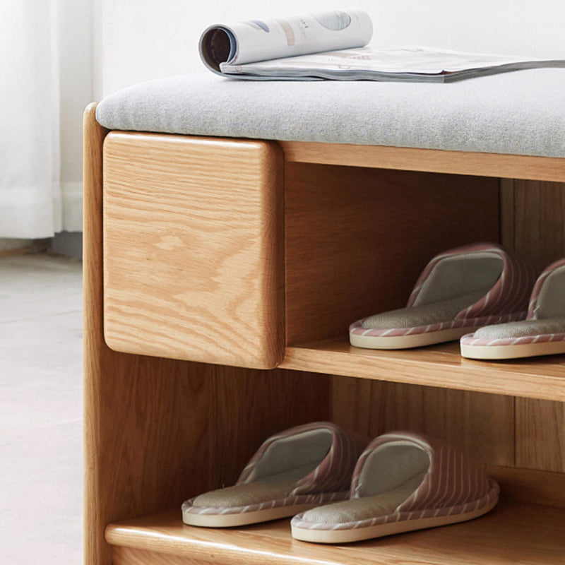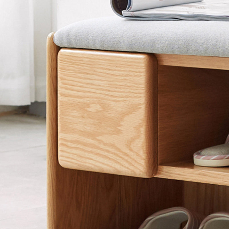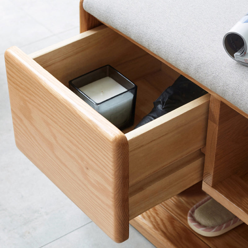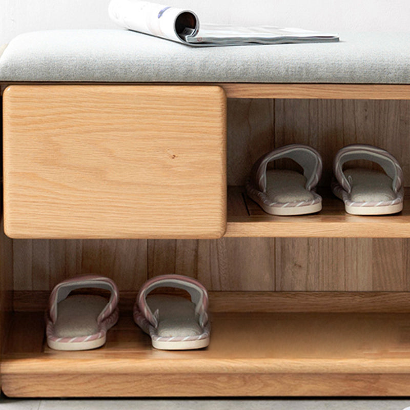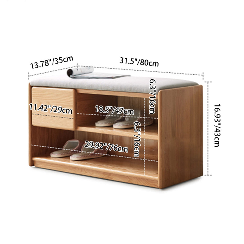 Crafted from solid rubber wood with a soft linen-upholstered seat, this modern minimalist rectangular shoe bench brings both comfort and practicality to your entryway. Featuring 1 drawer and 2 open storage compartments, it offers convenient organization for daily footwear and essentials while showcasing a clean natural wood finish.