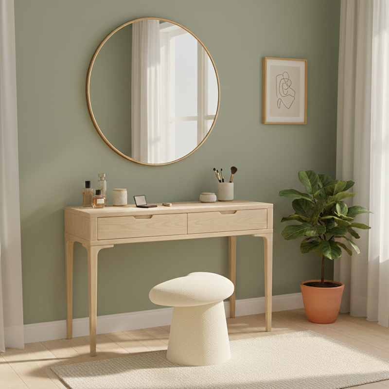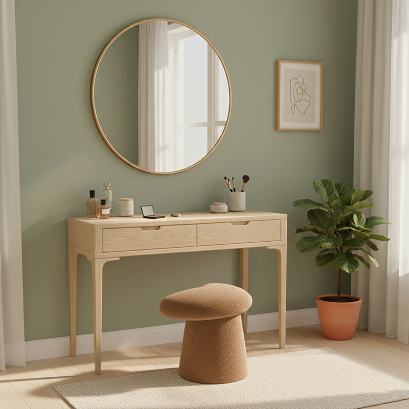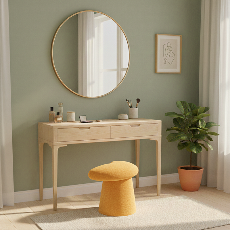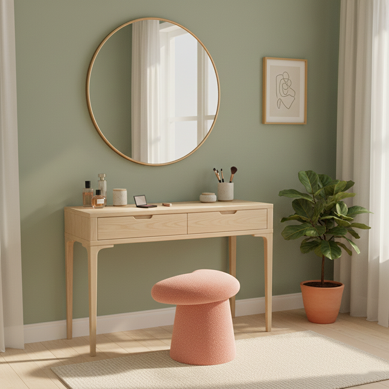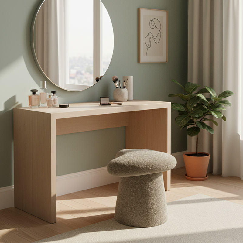 Add a playful yet elegant touch to your bedroom with this modern minimalist vanity stool, featuring a whale-tail–shaped cushioned seat and cylindrical base. Upholstered in soft lambswool with a solid multilayer wood core, it offers cozy comfort and comes in white, pink, black, yellow, gray, brown, and green, perfect for stylish bedroom vanity spaces.