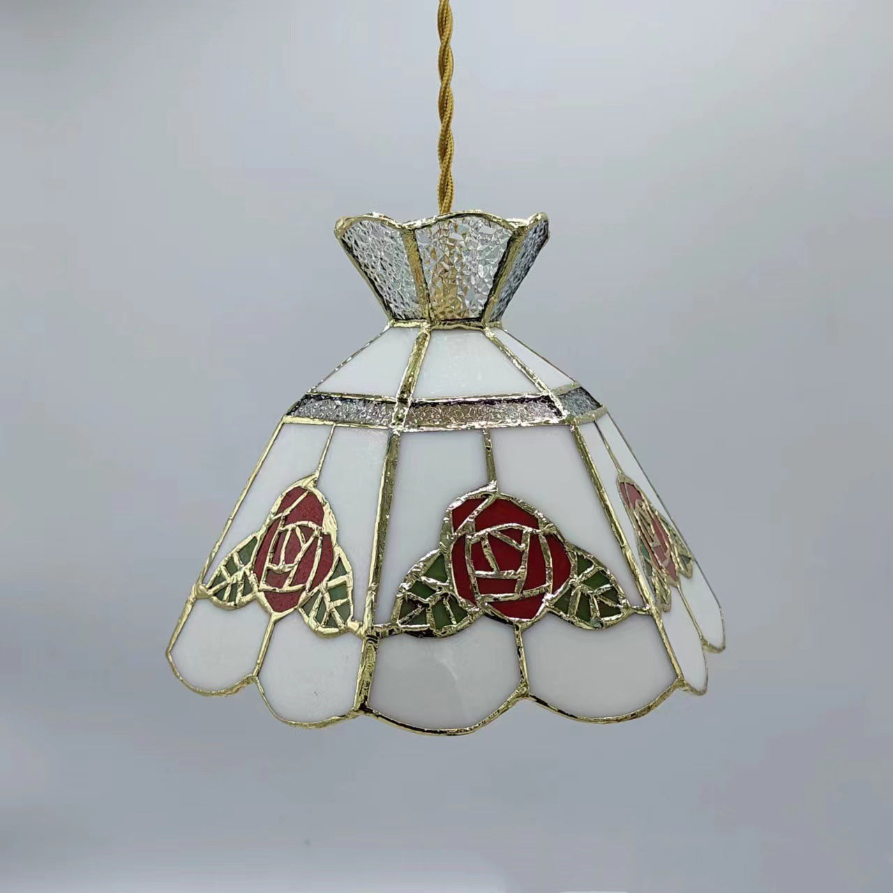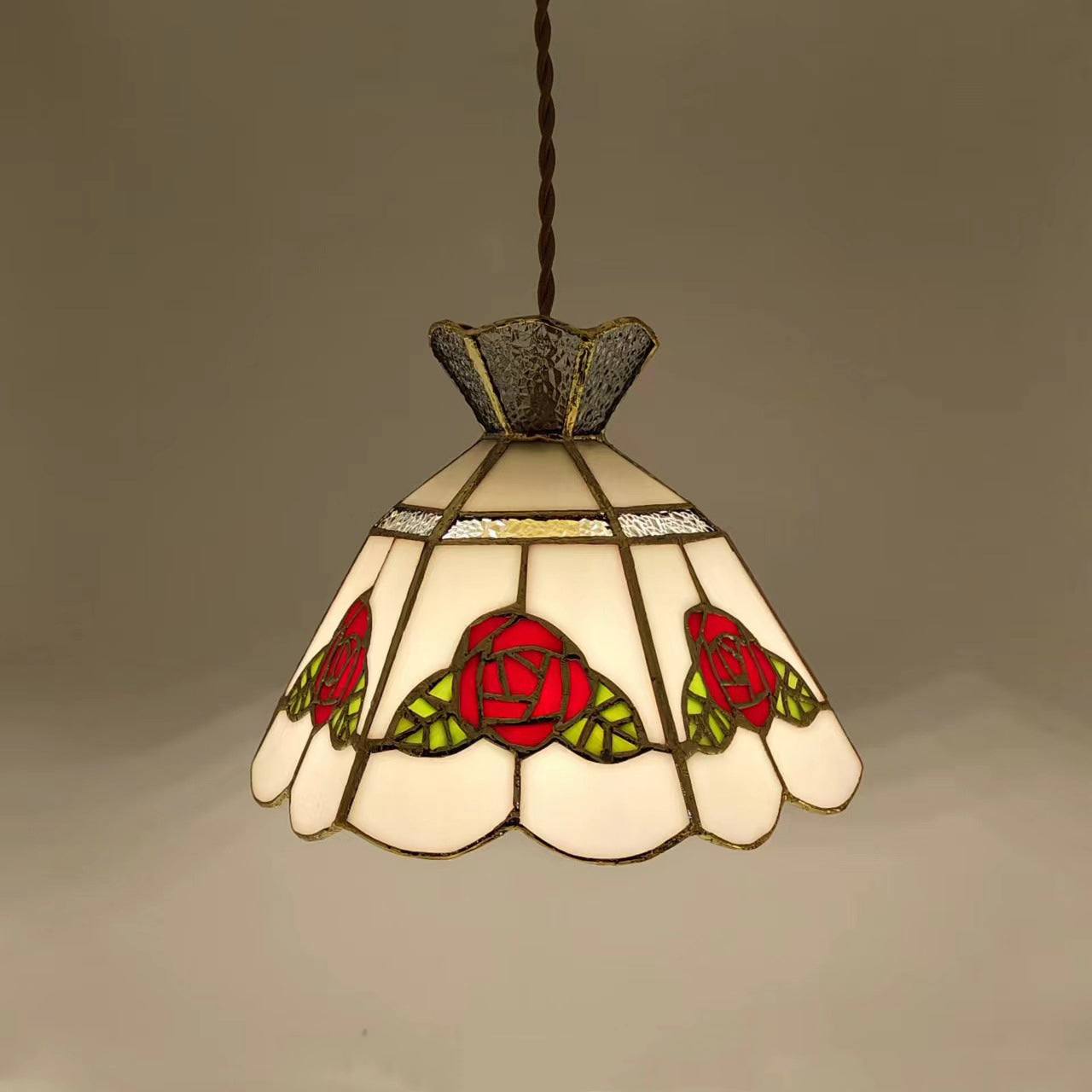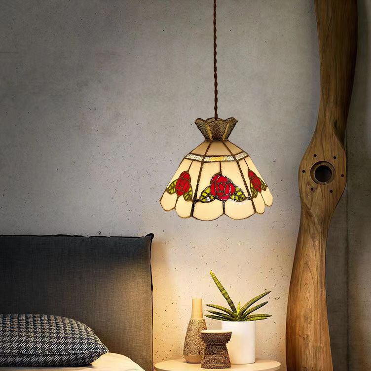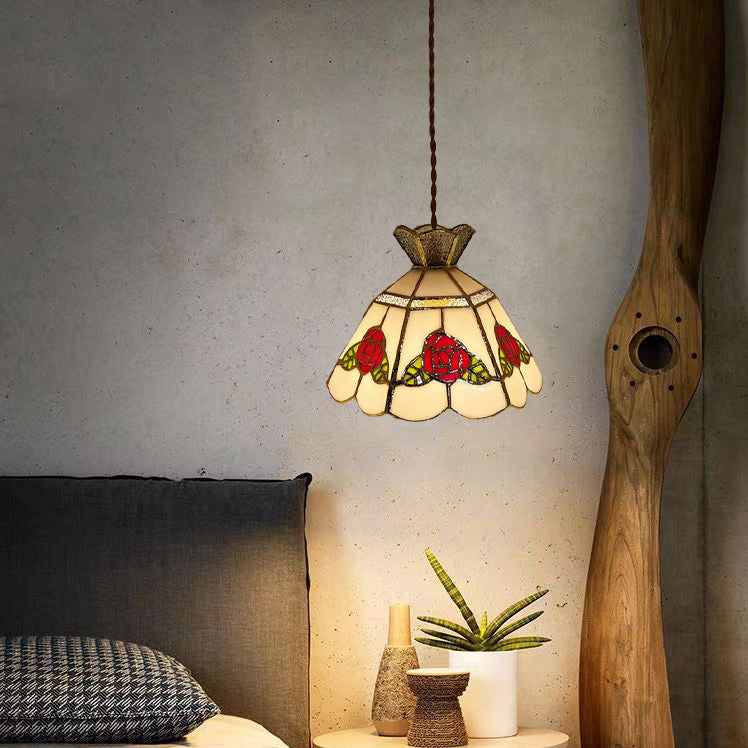 This handcrafted vintage pendant light features a rose and leaf design with vibrant red and green glass, accented with brass and silver details. The 1-light fixture provides a warm and inviting glow, perfect for adding a touch of luxury to your dining room, entryway, or bar area. Its timeless appeal combines traditional craftsmanship with modern elegance.