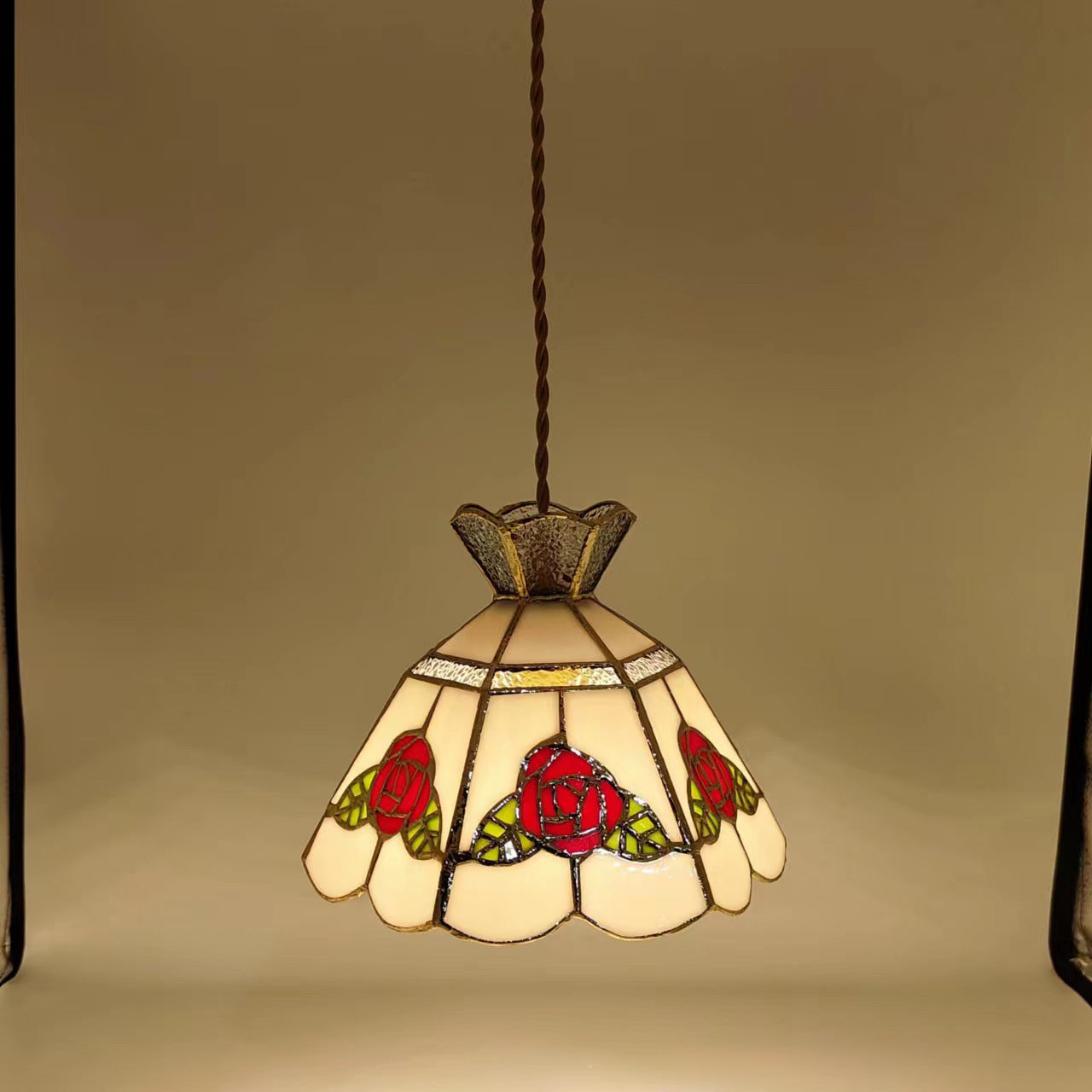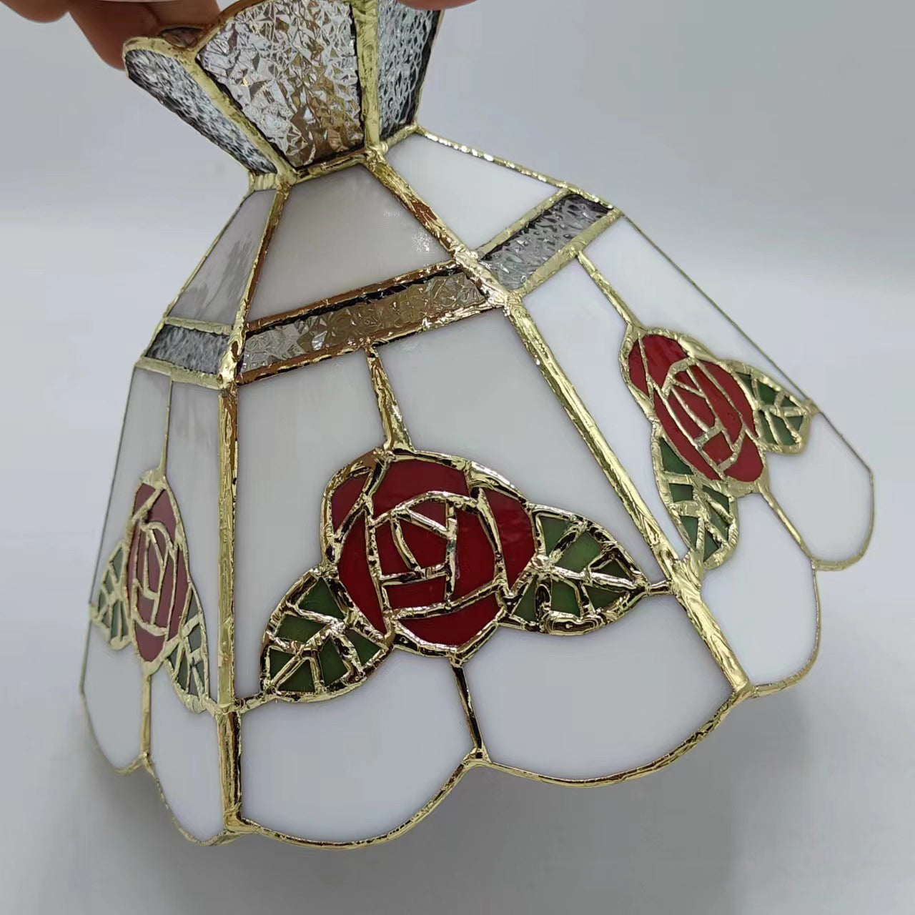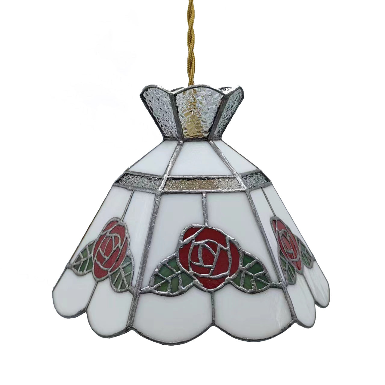 This handcrafted vintage pendant light features a rose and leaf design with vibrant red and green glass, accented with brass and silver details. The 1-light fixture provides a warm and inviting glow, perfect for adding a touch of luxury to your dining room, entryway, or bar area. Its timeless appeal combines traditional craftsmanship with modern elegance.