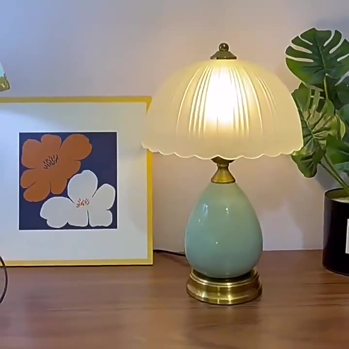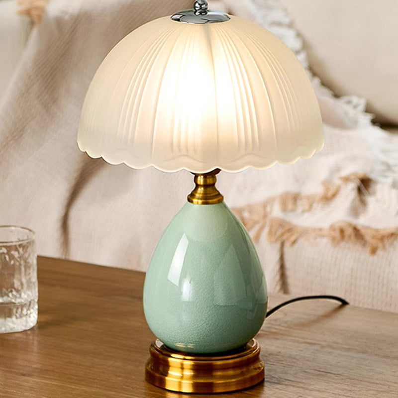 Crafted from ceramic, glass, and metal, this 1-light traditional vintage table lamp features a teardrop-shaped base and a half-dome glass shade in a calming green finish. Its soft, non-glaring light and fine texture make it a cozy and elegant addition to any bedroom décor.