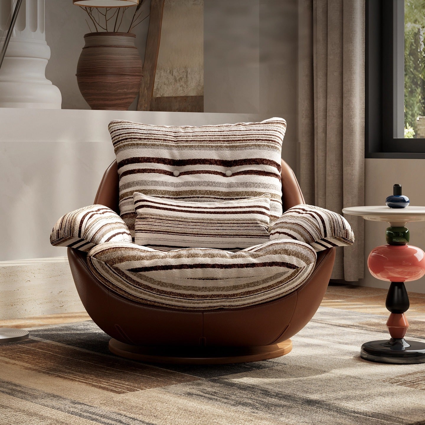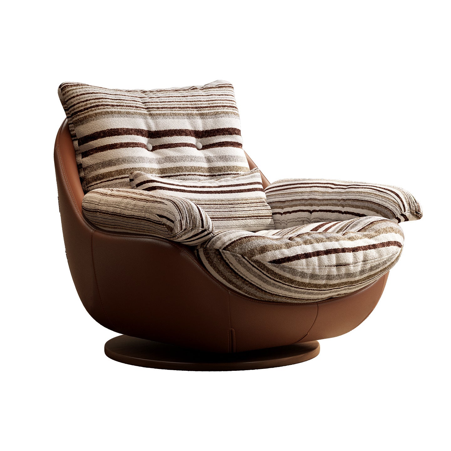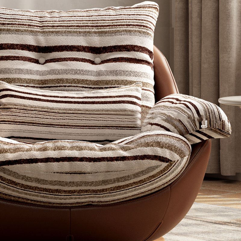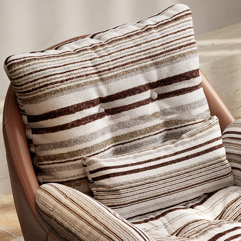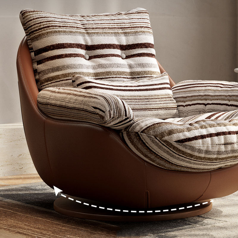 Add a touch of vintage charm to your living room with this curved swivel lounge chair, crafted from premium fabric, faux leather, and solid wood with down filling. Designed with a reclining function, soft cushioning, and supportive armrests, it offers both comfort and timeless style. The easy-to-clean coffee brown finish makes it perfect for cozy corners, reading nooks, or boutique spaces.