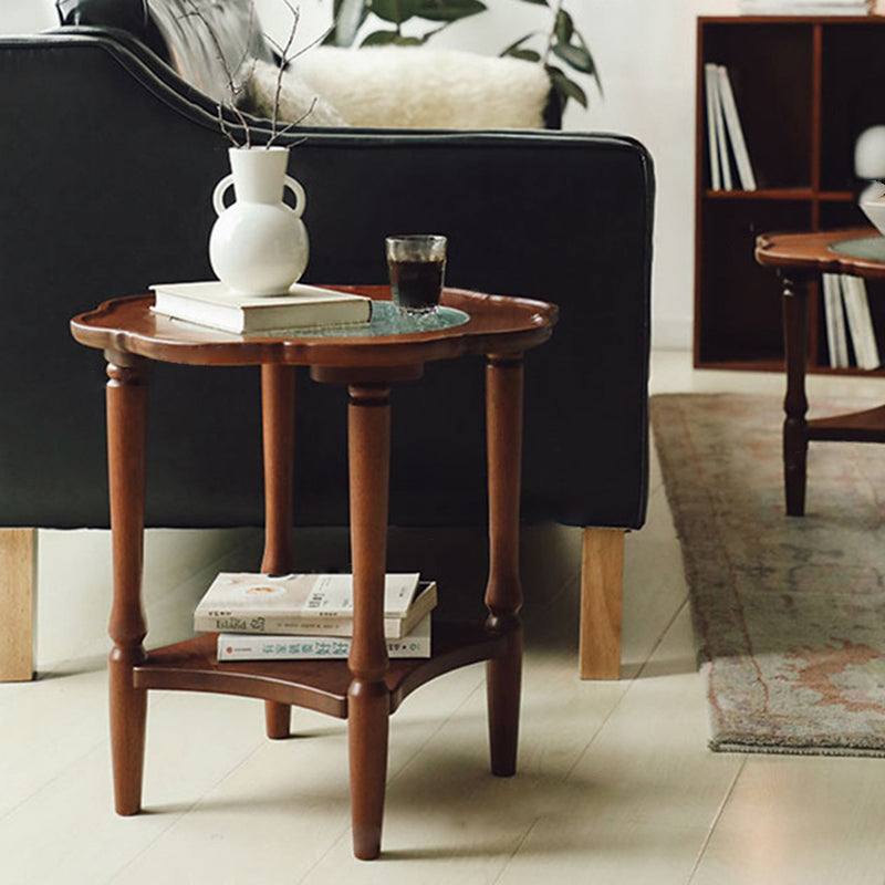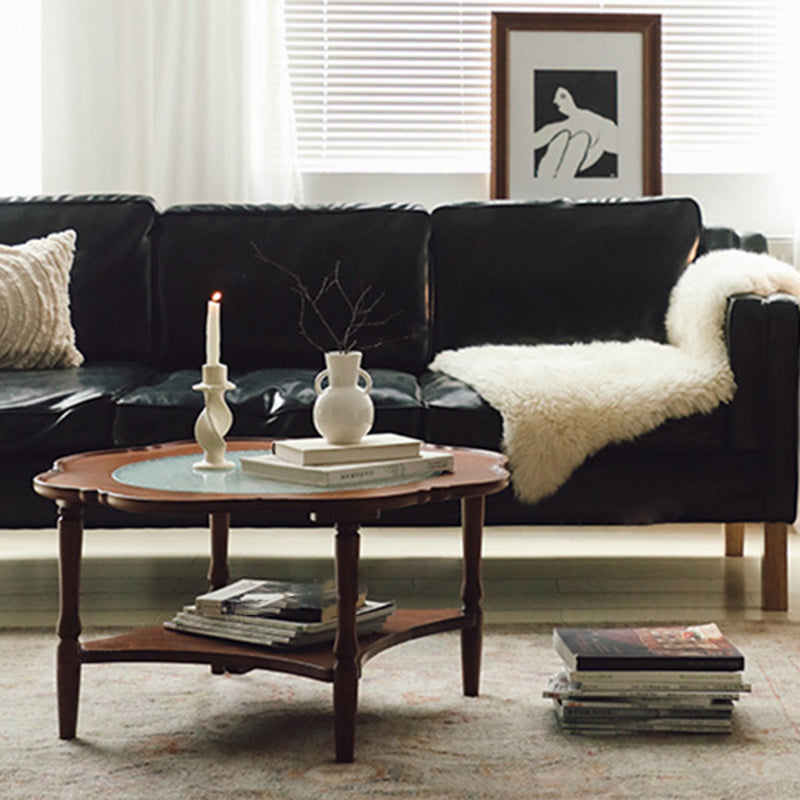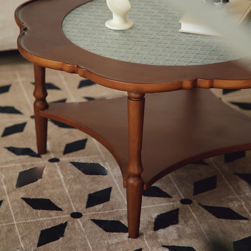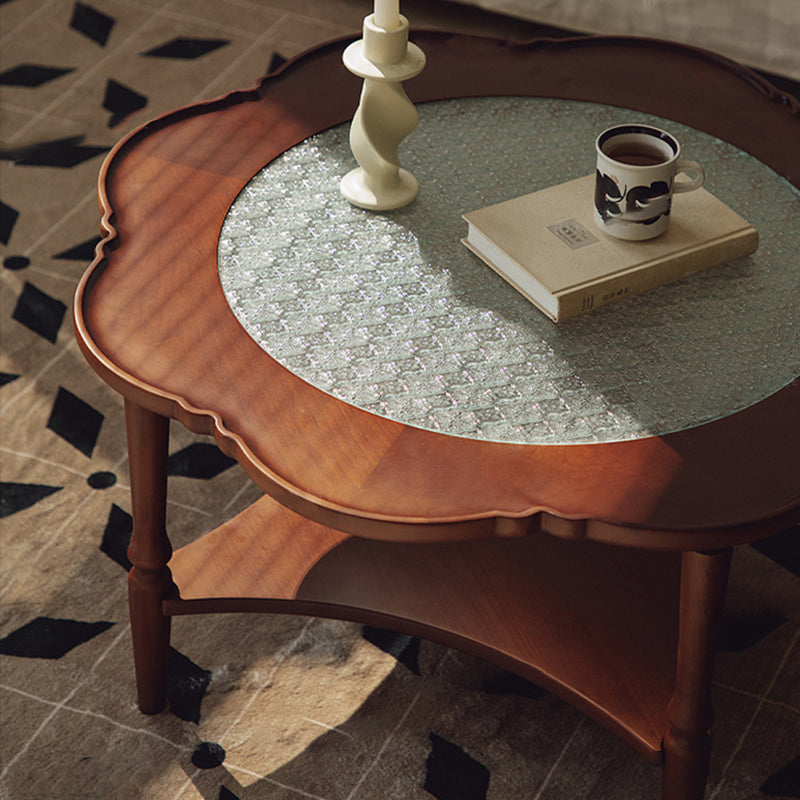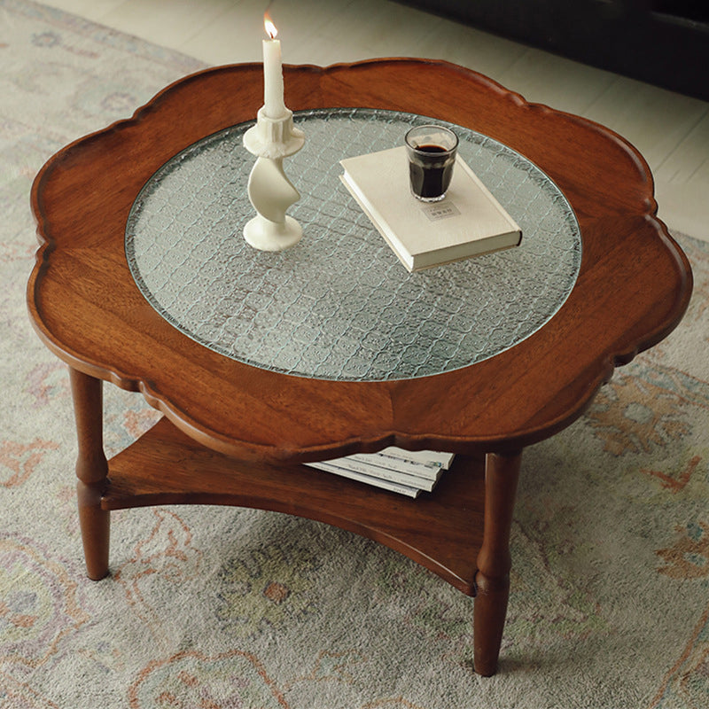 Brighten your living space with this charming modern minimalist coffee table. Its distinctive flower shape provides a fresh, contemporary touch, beautifully combining rich solid wood and elegant glass in a warm walnut finish.