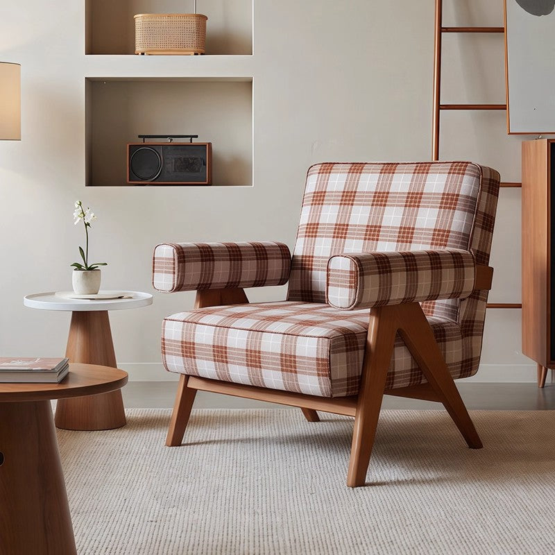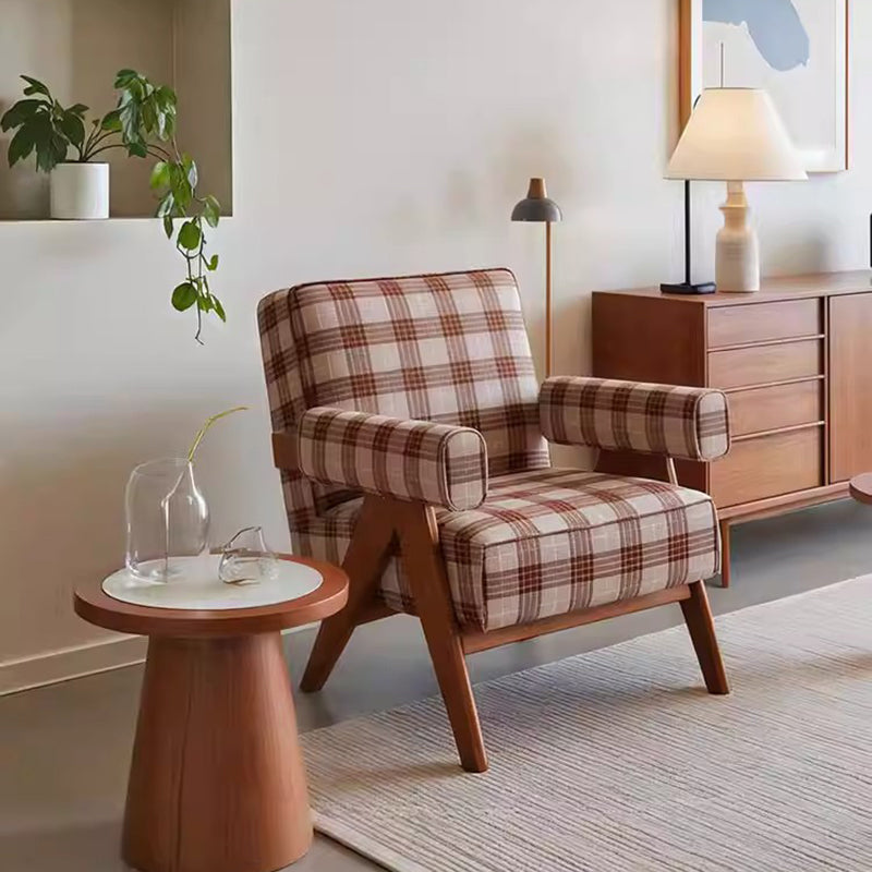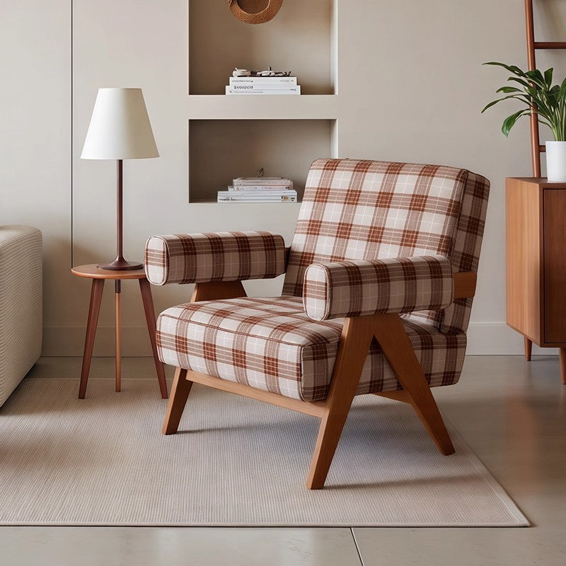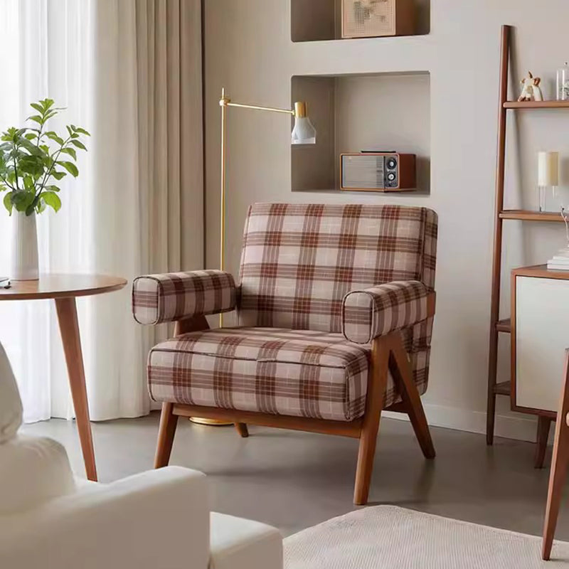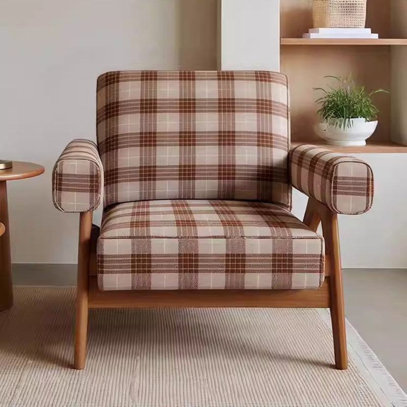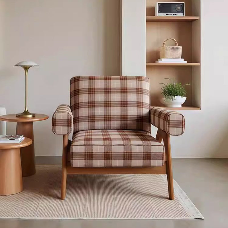 This vintage-inspired sofa chair features breathable jacquard fabric, a durable solid ash wood frame, and plush high-elastic sponge for comfortable everyday seating. Designed with a supportive backrest and armrests, it offers stable support and a skin-friendly feel. Available in a warm brown tone, this rectangular lounge chair adds a classic retro touch to any living room.