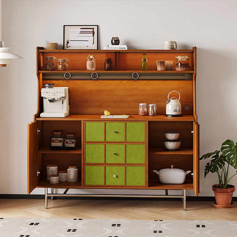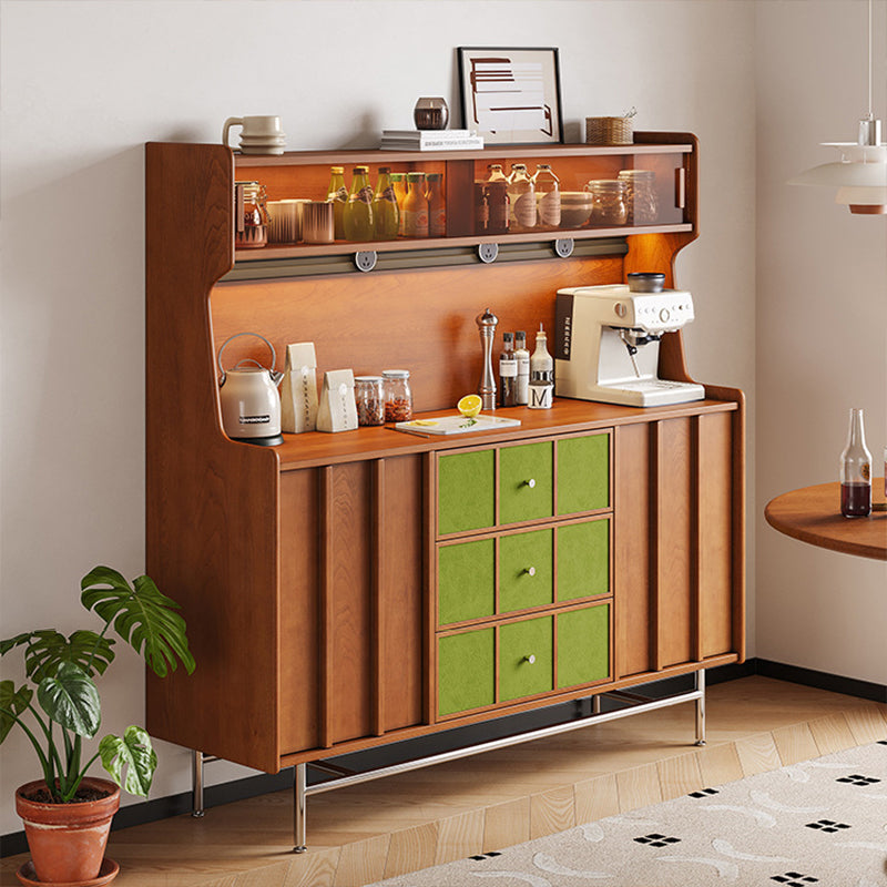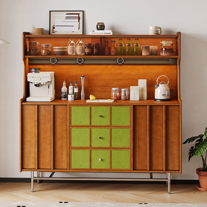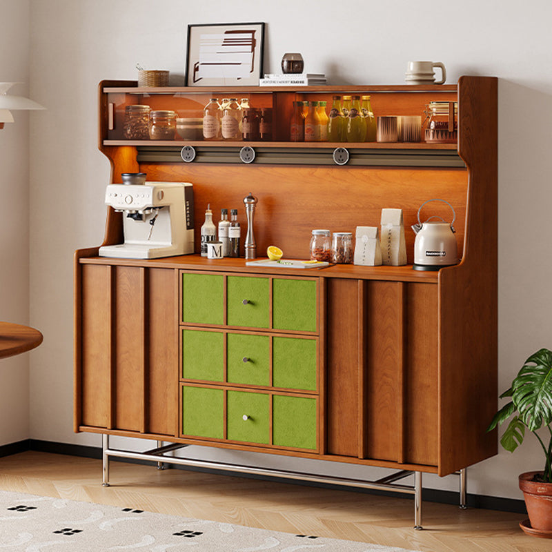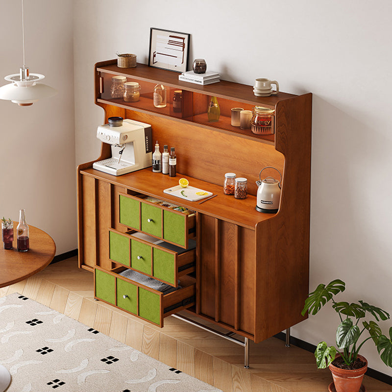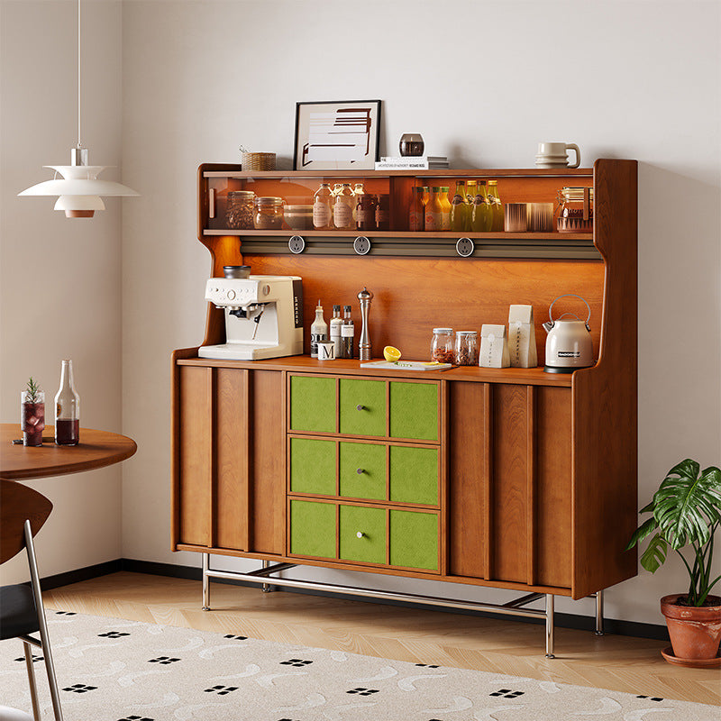 Exuding traditional vintage charm, this statement storage cabinet is built with a solid multilayer wood frame and finished in rich walnut, accented by stainless steel hardware. Designed for versatile organization, it offers three drawers, two spacious cabinets, and three open display shelves. Its durable, eco-friendly construction provides ample space for both storing and showcasing items, making it an ideal accent piece for living rooms, dedicated coffee bars, or sophisticated home beverage stations.