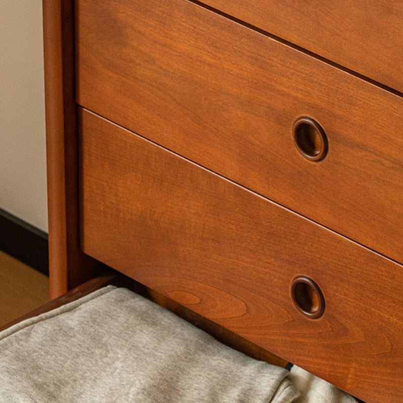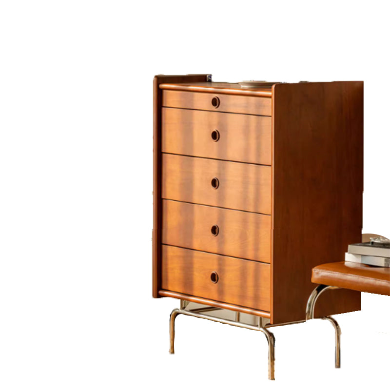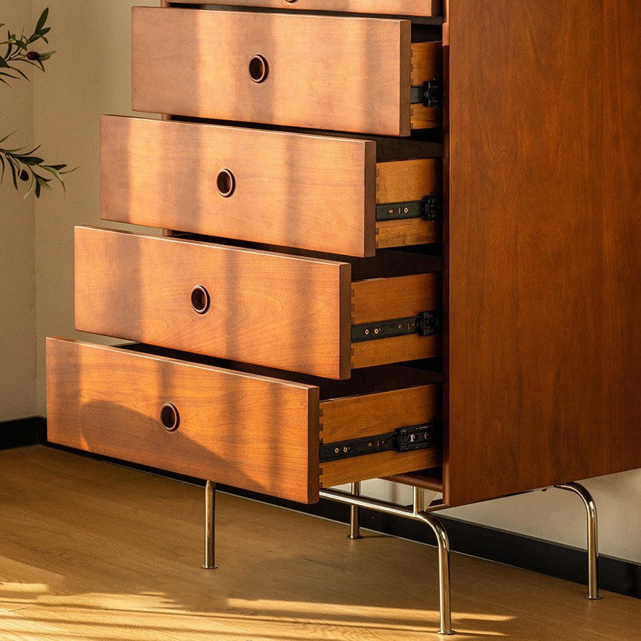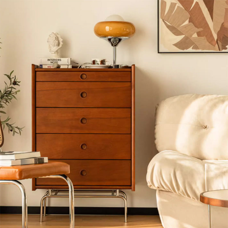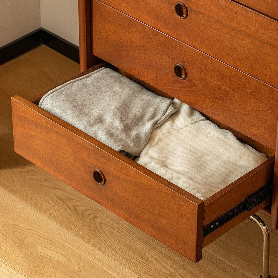 This traditional solid wood storage cabinet features five smooth-glide drawers crafted from pine and cherry wood, finished in a warm cherry tone. Built with a sturdy multi-layer wood back panel and stainless steel legs for long-lasting stability, it's an elegant and durable storage solution for bedrooms or living rooms.