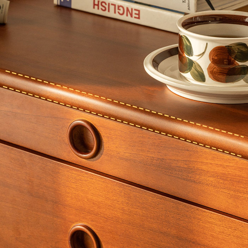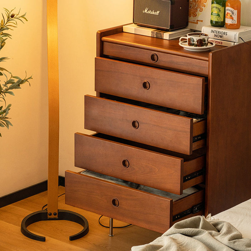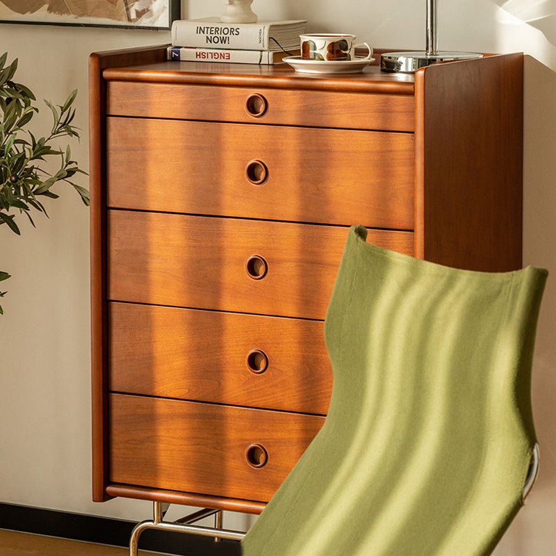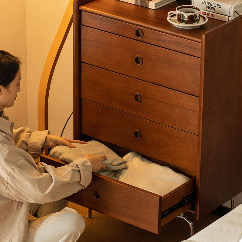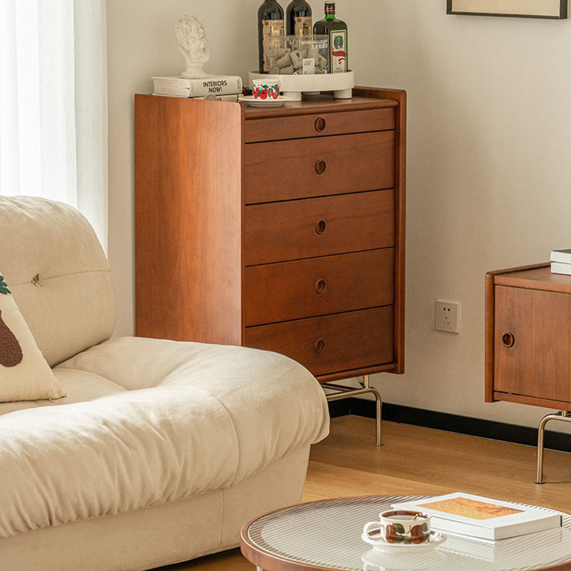 This traditional solid wood storage cabinet features five smooth-glide drawers crafted from pine and cherry wood, finished in a warm cherry tone. Built with a sturdy multi-layer wood back panel and stainless steel legs for long-lasting stability, it's an elegant and durable storage solution for bedrooms or living rooms.