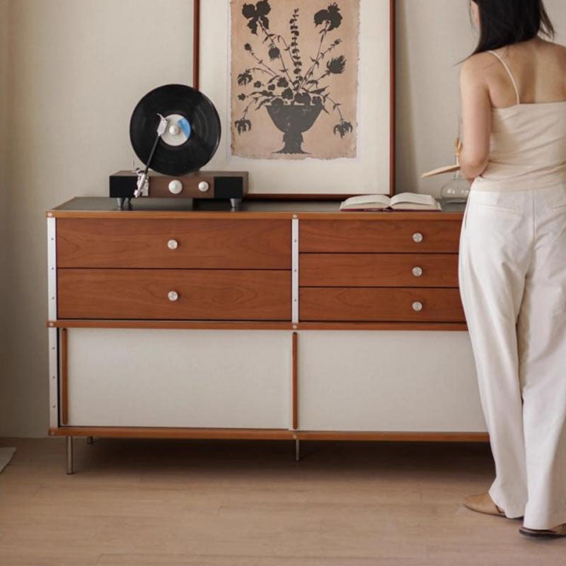 Infuse your dining room with timeless elegance using this beautiful traditional sideboard. It boasts a sophisticated two-tone design, featuring a classic walnut and white finish that anchors any space. Crafted for enduring quality, it features a highly durable sintered stone top for superior resilience against heat and scratches, paired with a sturdy solid pine wood frame for exceptional stability and longevity.
