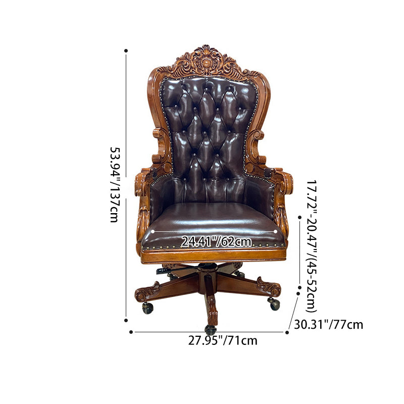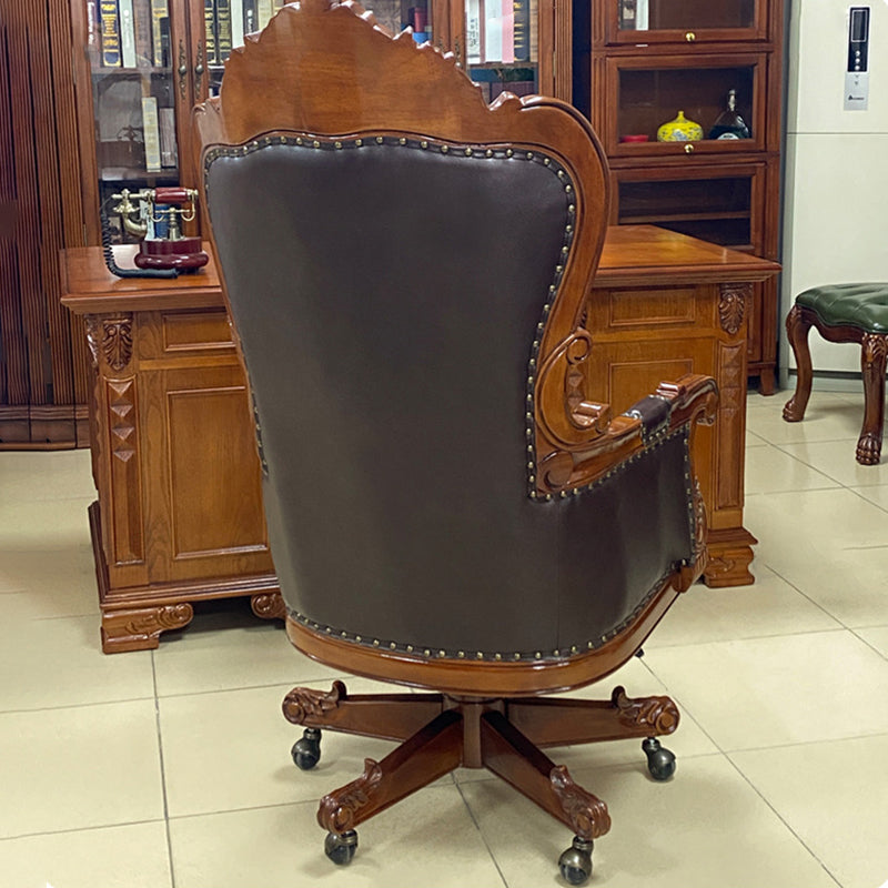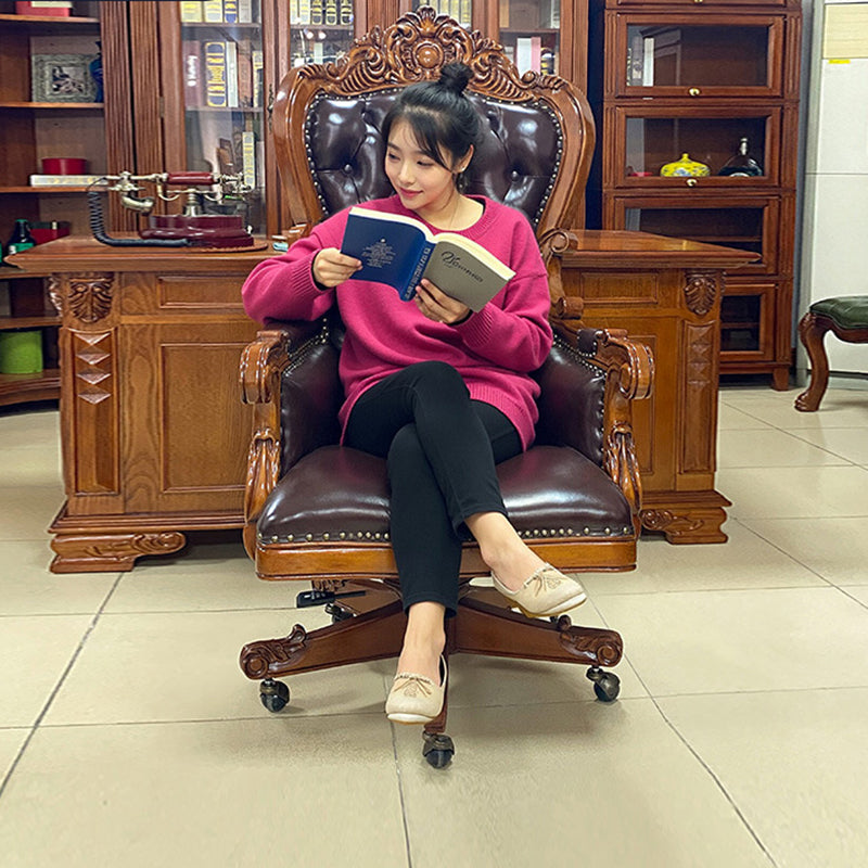 Designed for the modern professional who values "ergonomic tradition," this chair combines orthopedic support with effortless mobility. The wraparound backrest and integrated armrests are meticulously contoured to cradle the body, reducing fatigue during extended meetings. Beneath its vintage exterior lies a high-performance 360-degree swivel base equipped with whisper-quiet, smooth-rolling wheels, ensuring seamless transitions across your office floor. This is the premier choice for North American consumers searching for luxury top-grain leather office chairs, traditional carved wood desk chairs, vintage executive seating, and ergonomic brown leather study chairs.