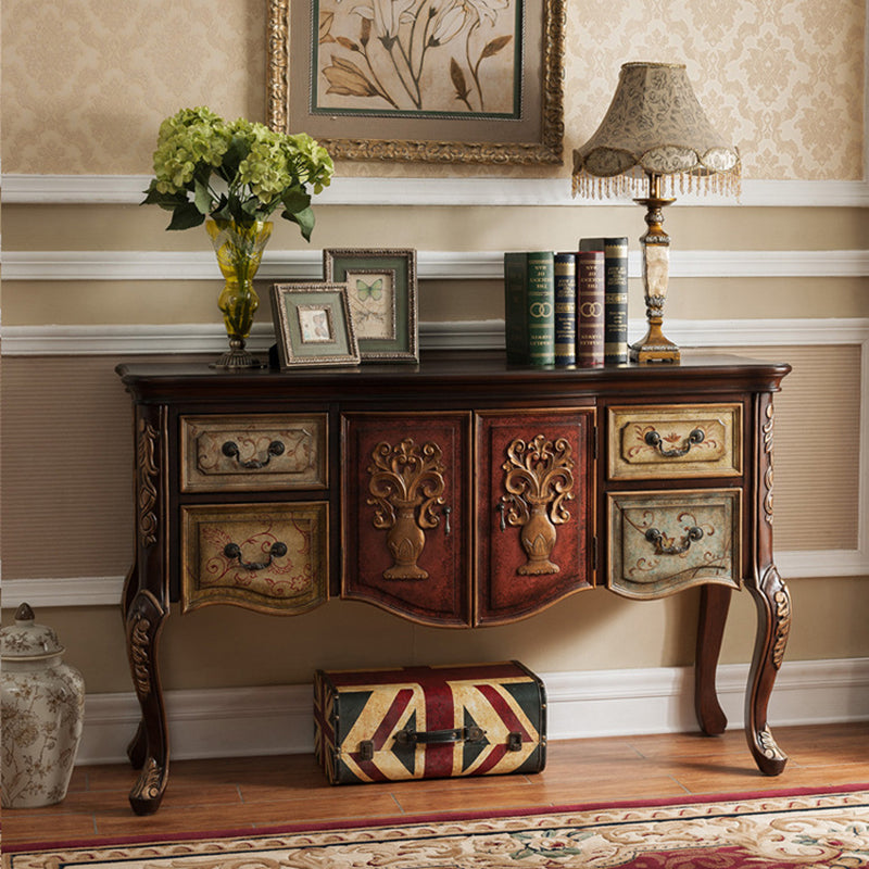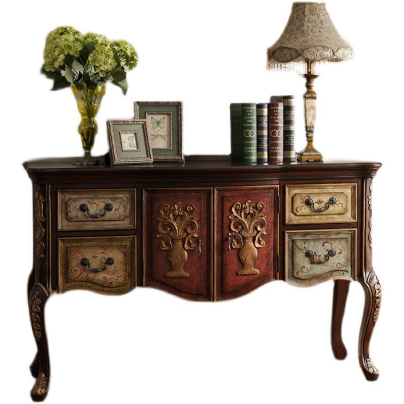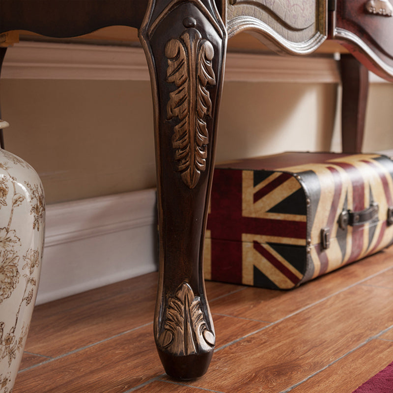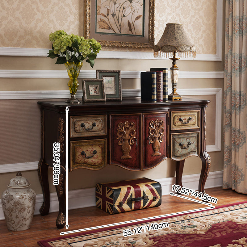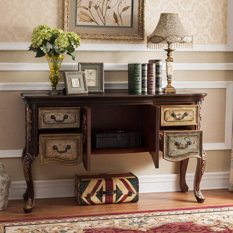 Enhance your home with this Traditional Vintage walnut-finished console table, crafted with a solid rubberwood frame and decorative engineered wood panels. Featuring 4 smooth-glide drawers and 1 spacious cabinet, it provides generous storage while functioning as an elegant console table for entryways, living rooms, or bedrooms. The rectangular silhouette, carved detailing, and classic American vintage style make it a refined and practical accent piece.