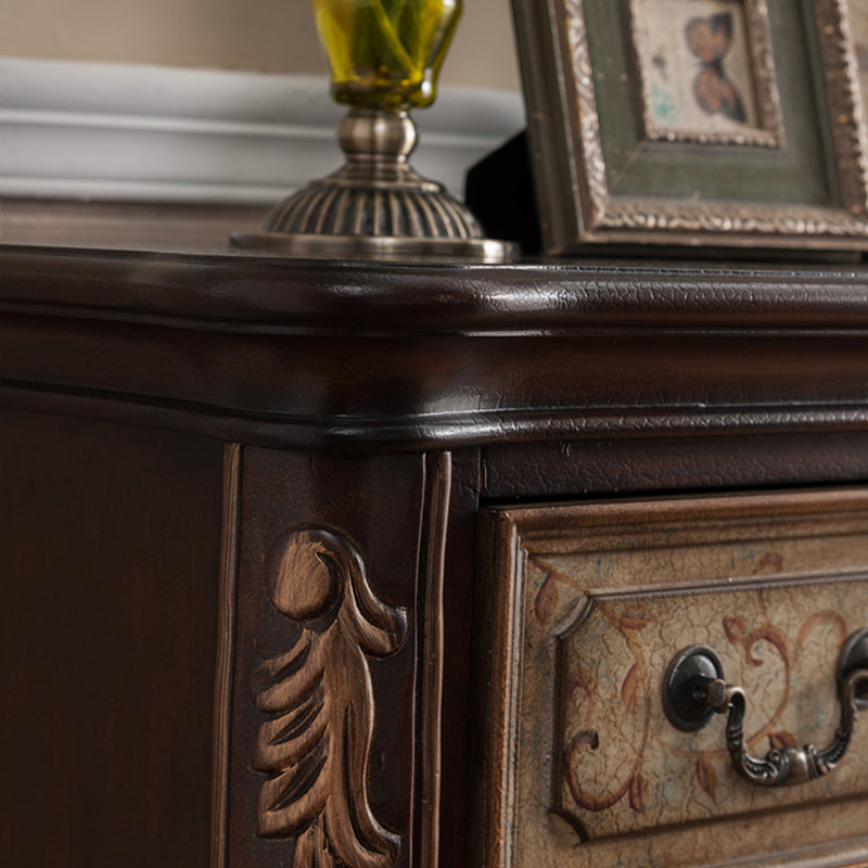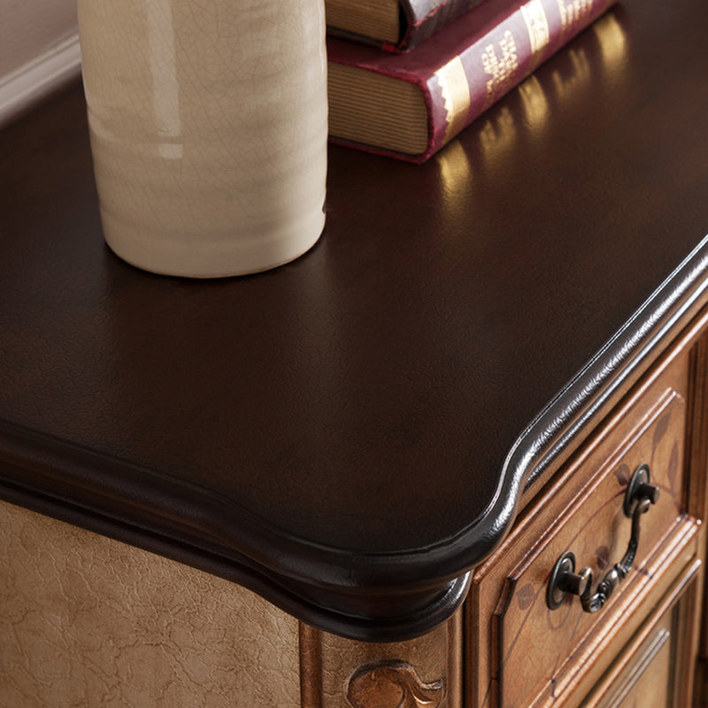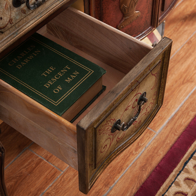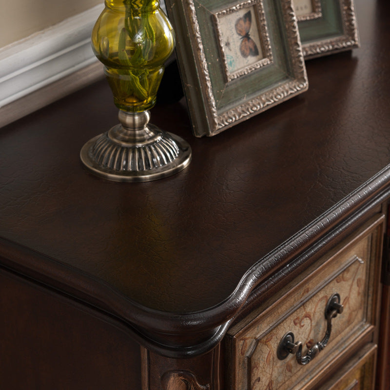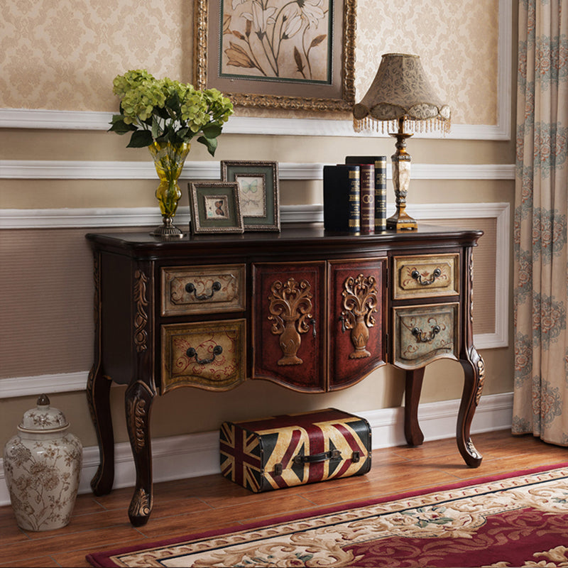 Enhance your home with this Traditional Vintage walnut-finished console table, crafted with a solid rubberwood frame and decorative engineered wood panels. Featuring 4 smooth-glide drawers and 1 spacious cabinet, it provides generous storage while functioning as an elegant console table for entryways, living rooms, or bedrooms. The rectangular silhouette, carved detailing, and classic American vintage style make it a refined and practical accent piece.