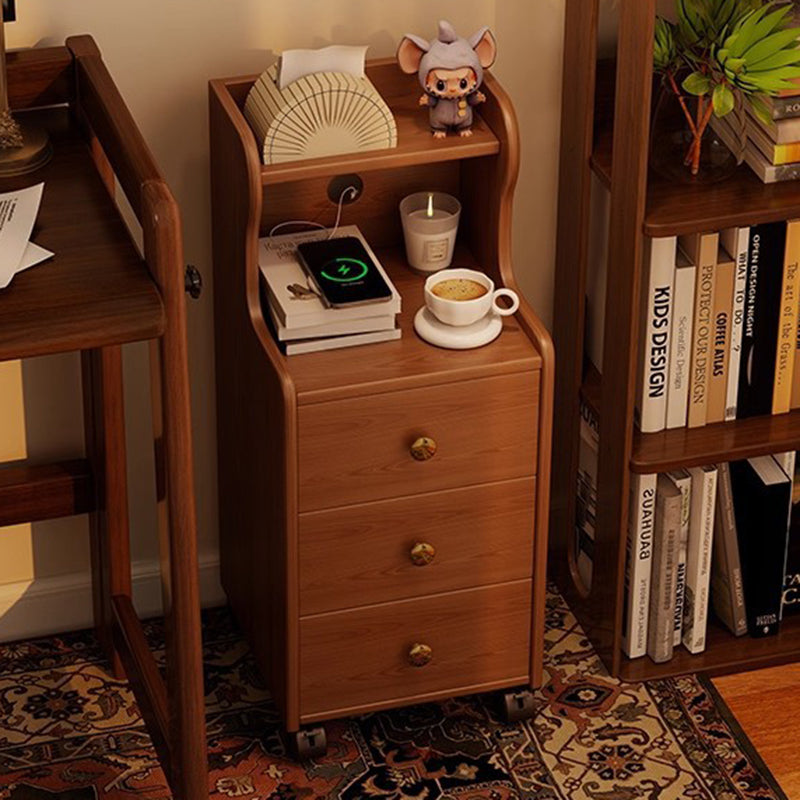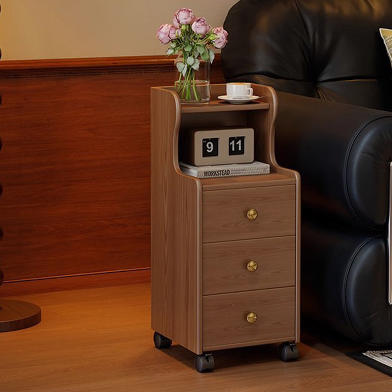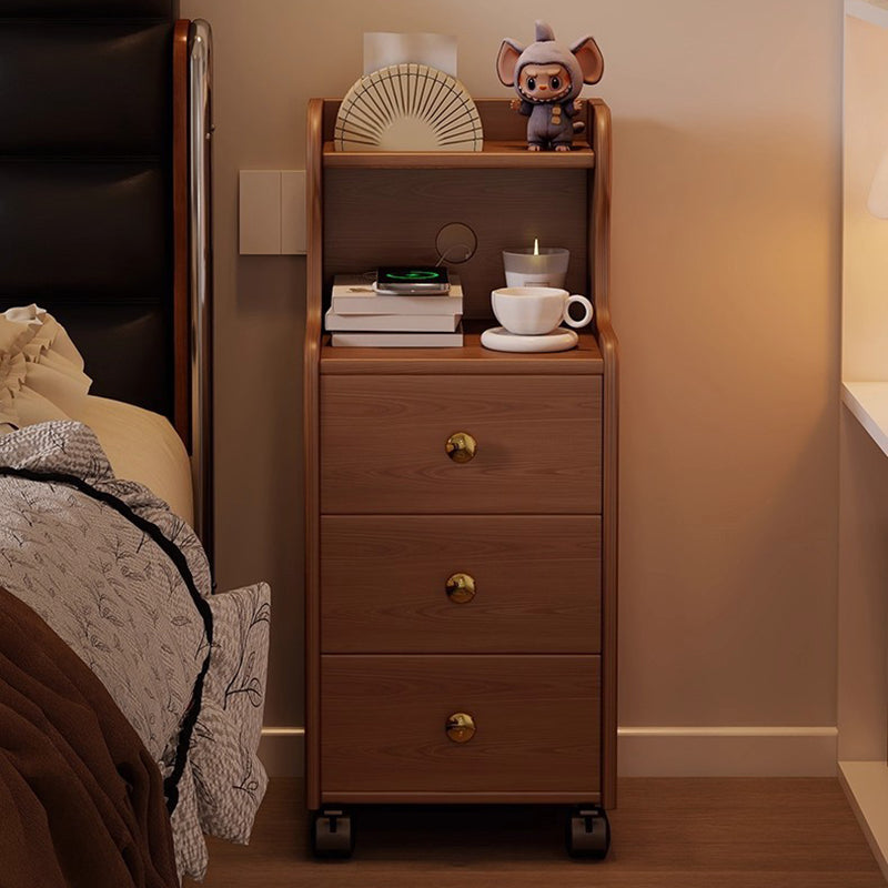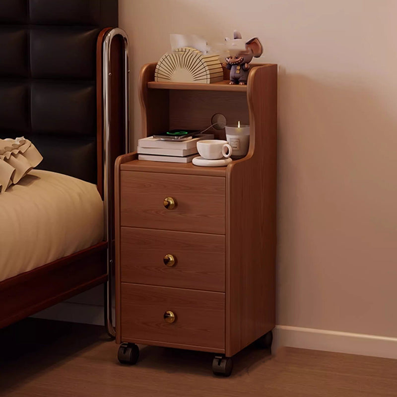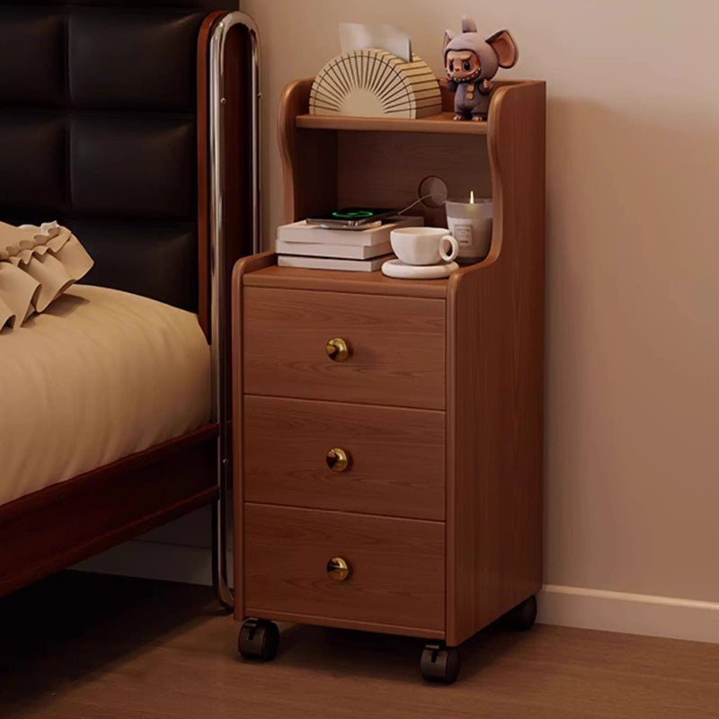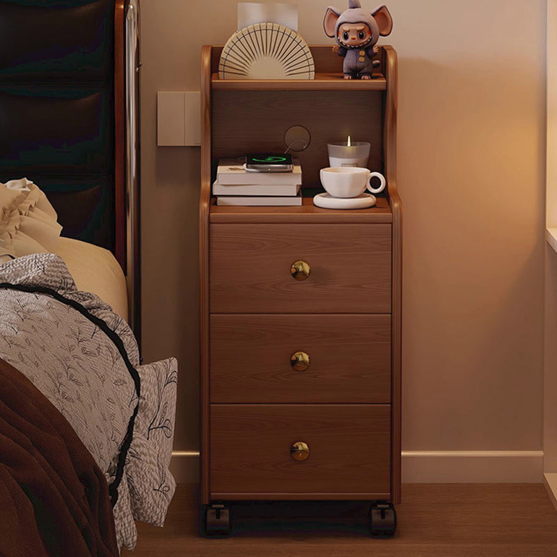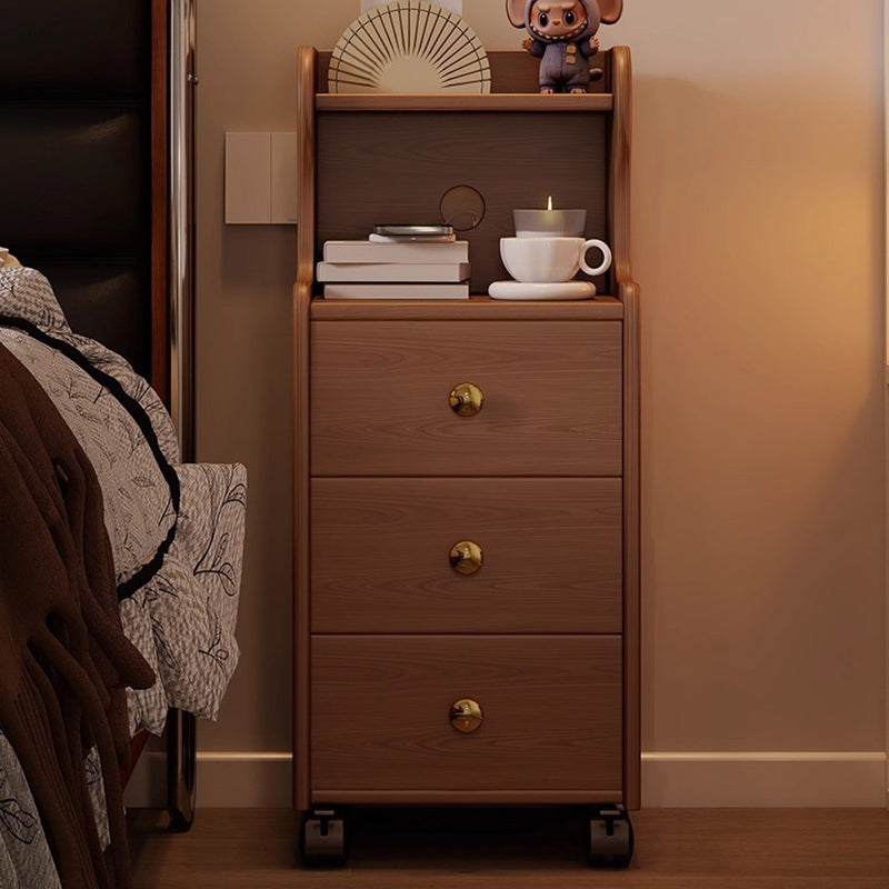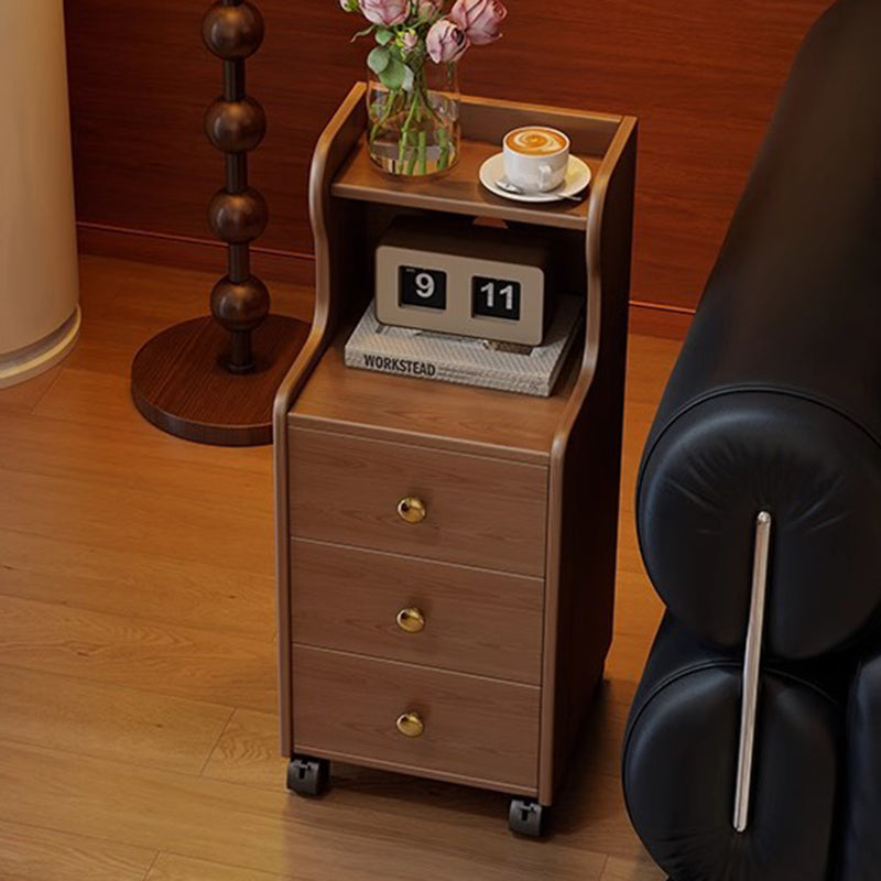 This traditional vintage nightstand is crafted from rubberwood and designed with a rectangular shape, featuring 3 drawers and a practical 2-tier open storage structure. Equipped with smooth-rolling wheels and rounded edges, it offers ample storage space and easy mobility, available in walnut, black, or natural wood finishes for living rooms or bedrooms.