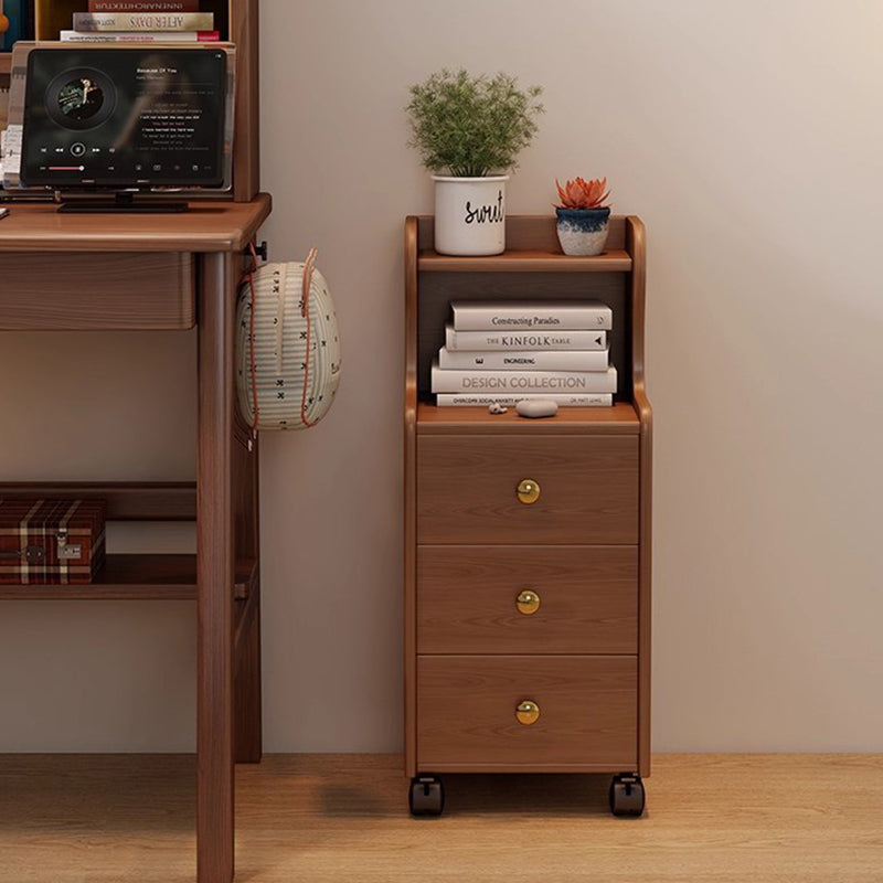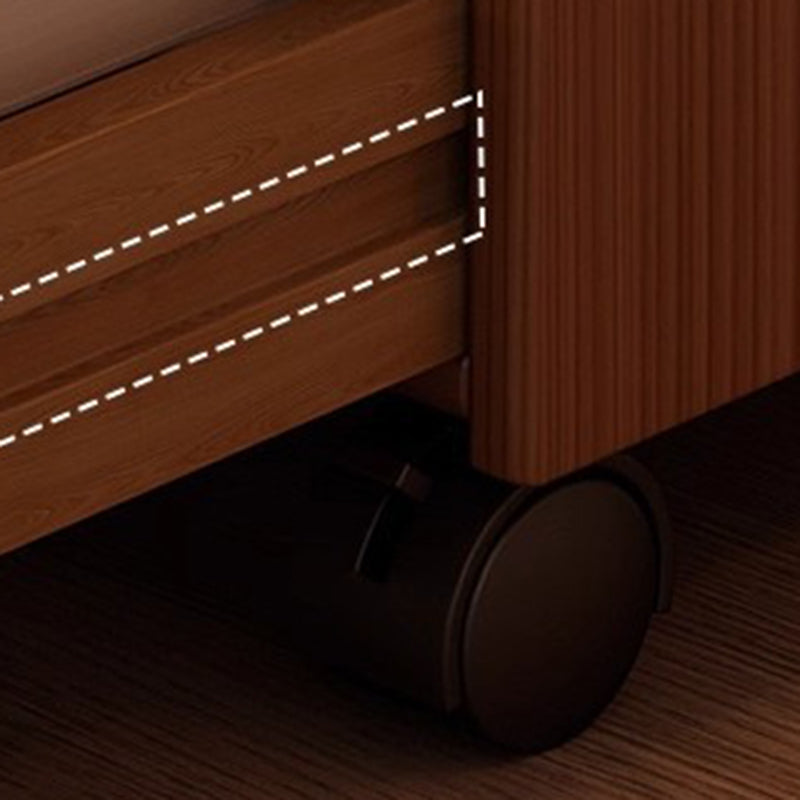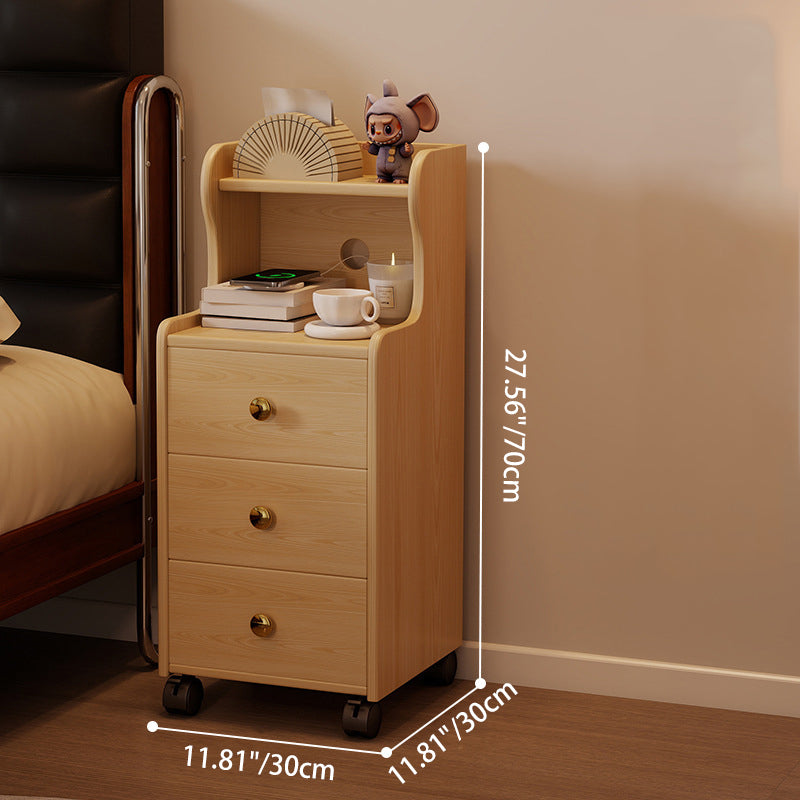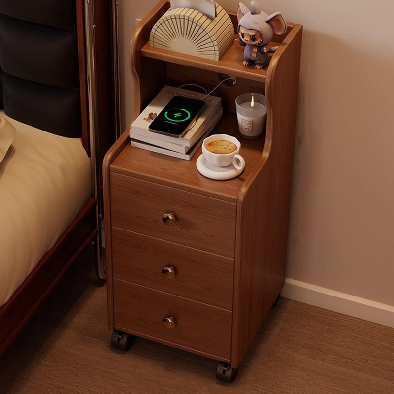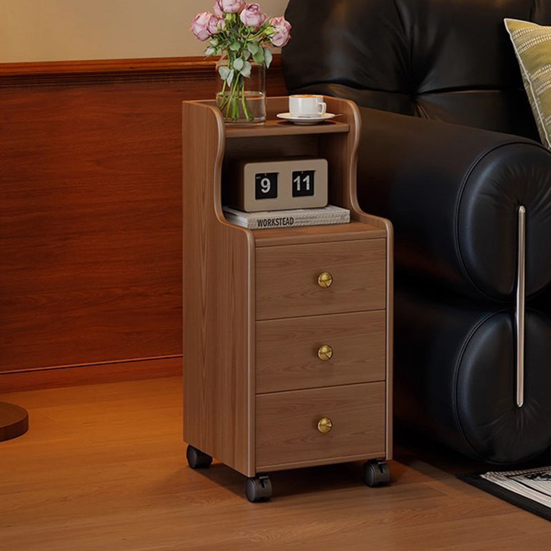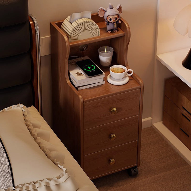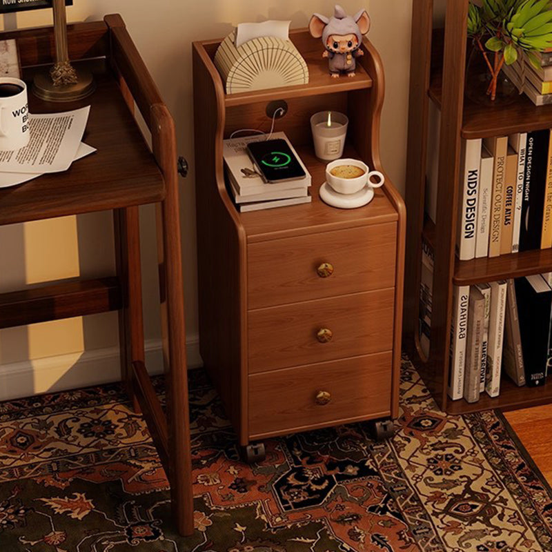 This traditional vintage nightstand is crafted from rubberwood and designed with a rectangular shape, featuring 3 drawers and a practical 2-tier open storage structure. Equipped with smooth-rolling wheels and rounded edges, it offers ample storage space and easy mobility, available in walnut, black, or natural wood finishes for living rooms or bedrooms.