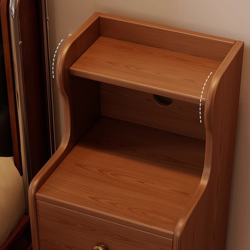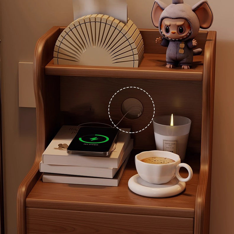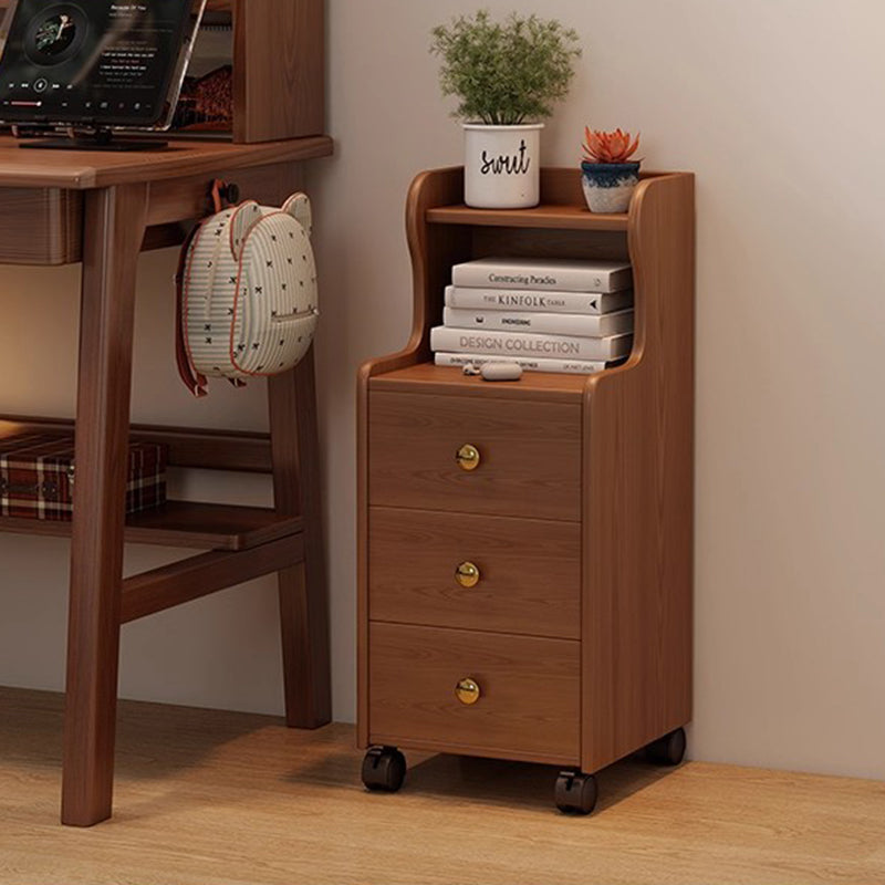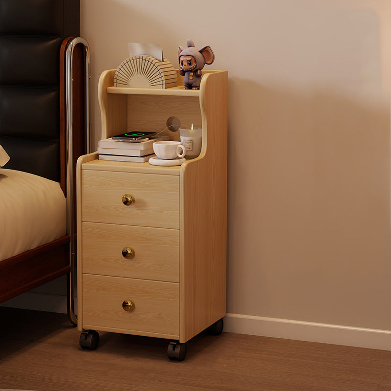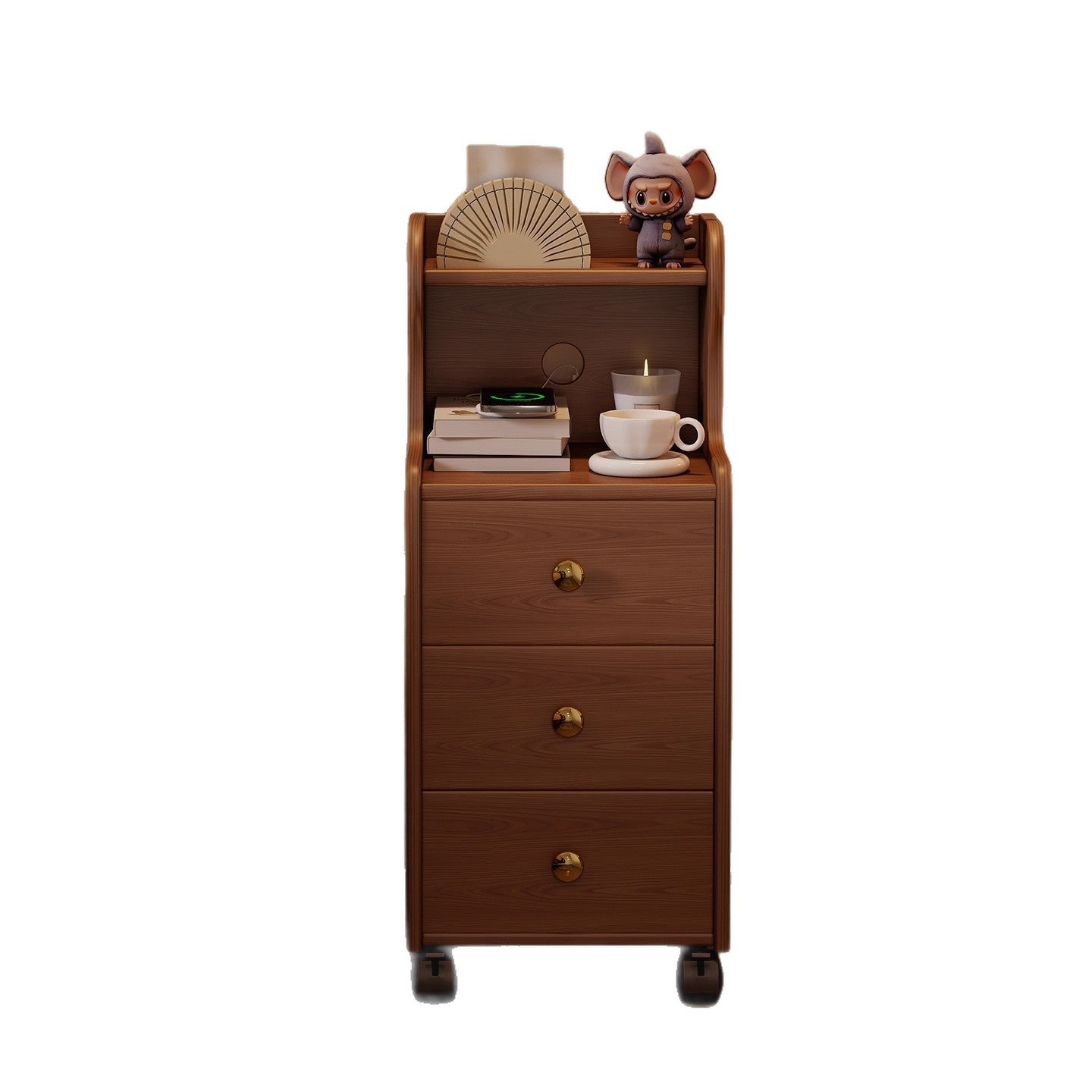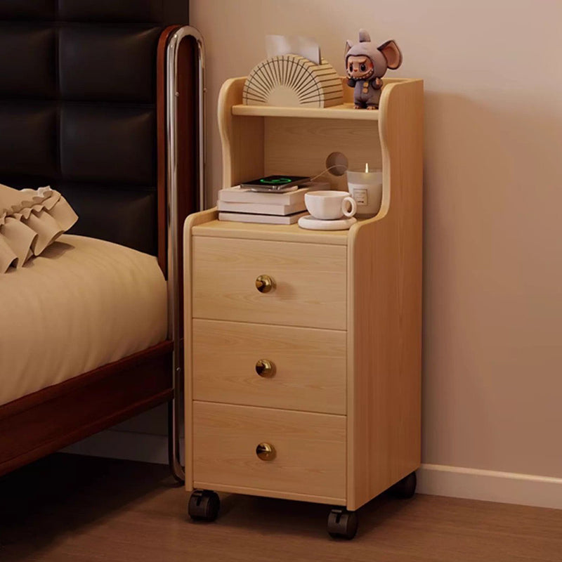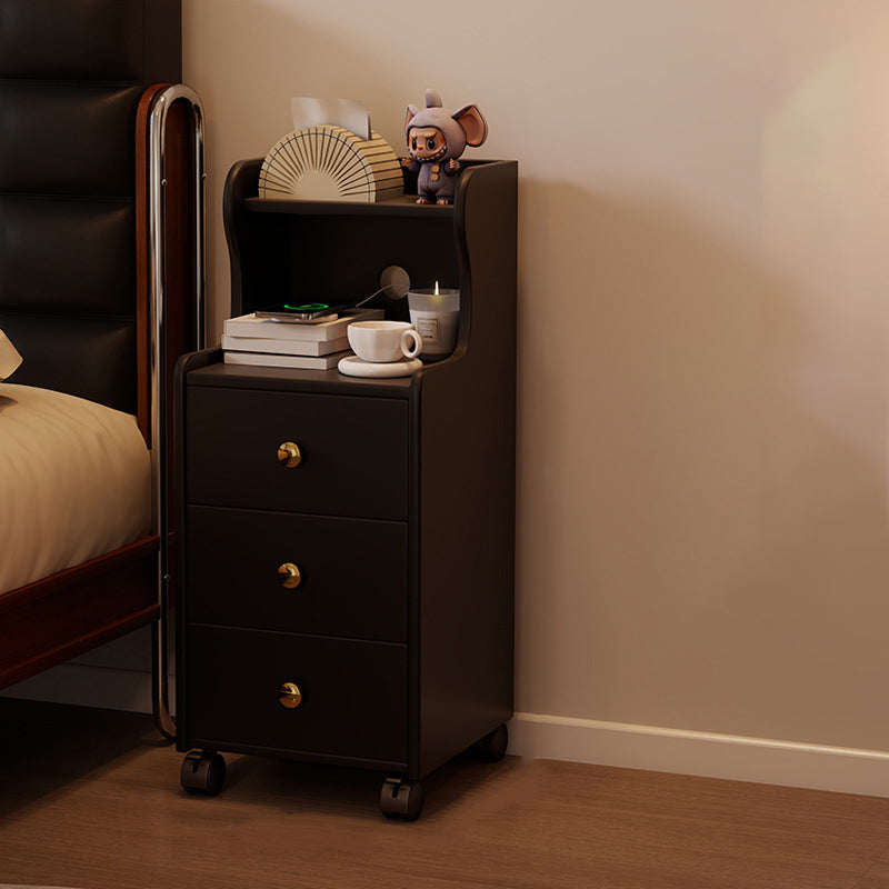 This traditional vintage nightstand is crafted from rubberwood and designed with a rectangular shape, featuring 3 drawers and a practical 2-tier open storage structure. Equipped with smooth-rolling wheels and rounded edges, it offers ample storage space and easy mobility, available in walnut, black, or natural wood finishes for living rooms or bedrooms.