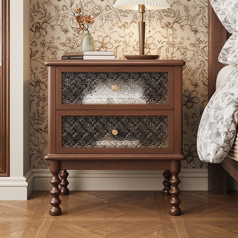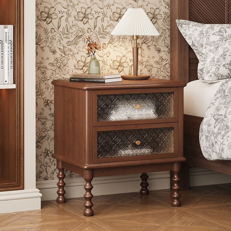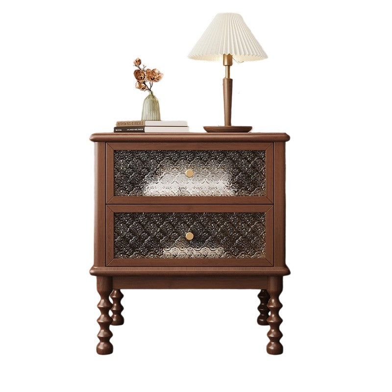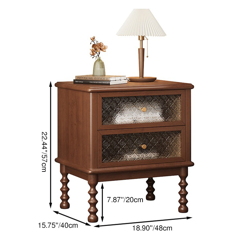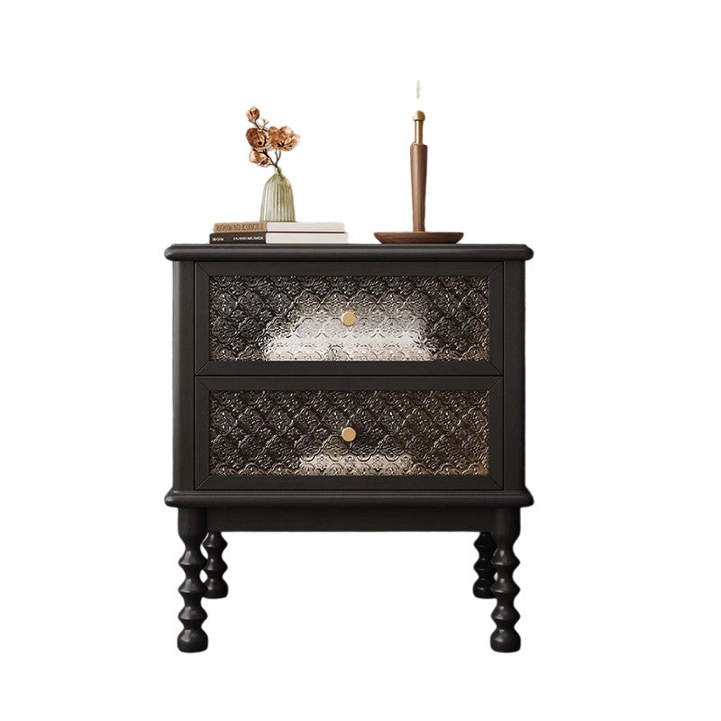 This traditional vintage nightstand combines solid wood, patterned glass, and metal accents for an elegant, nostalgic charm. Featuring two smooth-sliding drawers and a spacious tabletop in walnut or black finish, it offers both refined aesthetics and practical storage for your bedroom.