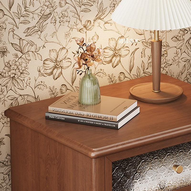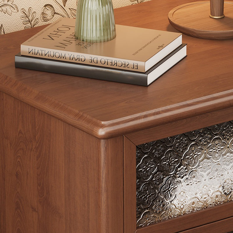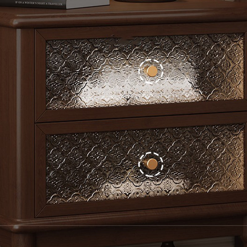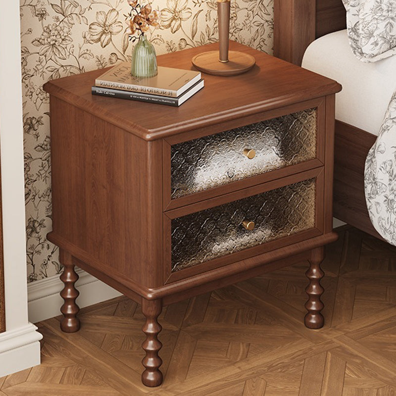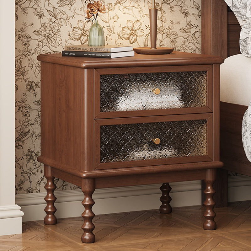 This traditional vintage nightstand combines solid wood, patterned glass, and metal accents for an elegant, nostalgic charm. Featuring two smooth-sliding drawers and a spacious tabletop in walnut or black finish, it offers both refined aesthetics and practical storage for your bedroom.