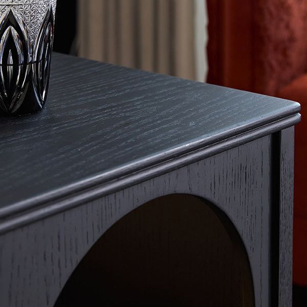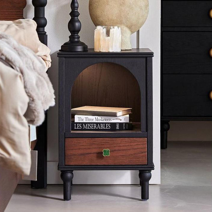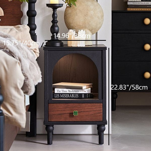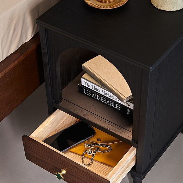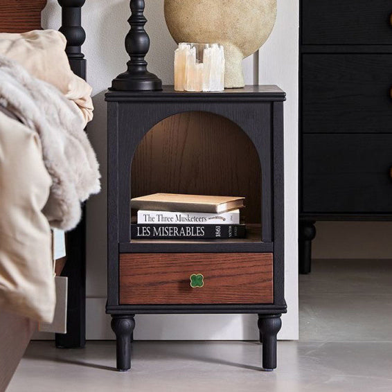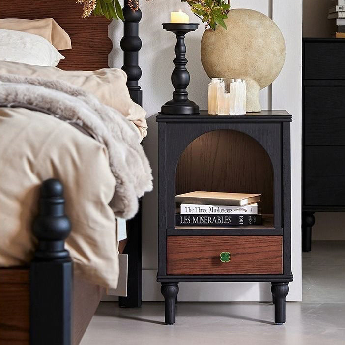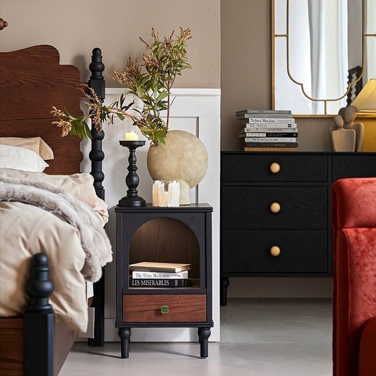 This traditional vintage nightstand combines solid wood and metal in a semi-circular and rectangular silhouette, offering a 1-drawer design with a cozy arched open space perfect even as a pet nook. Available in black, it features a soft ambient enclosure that blends aesthetics with function for any bedroom.