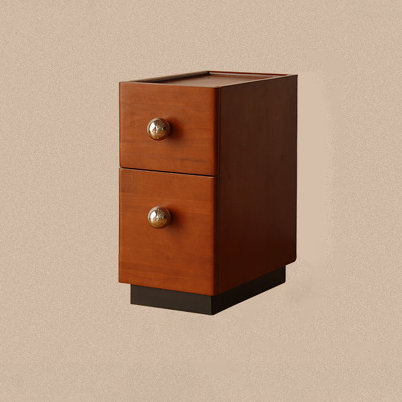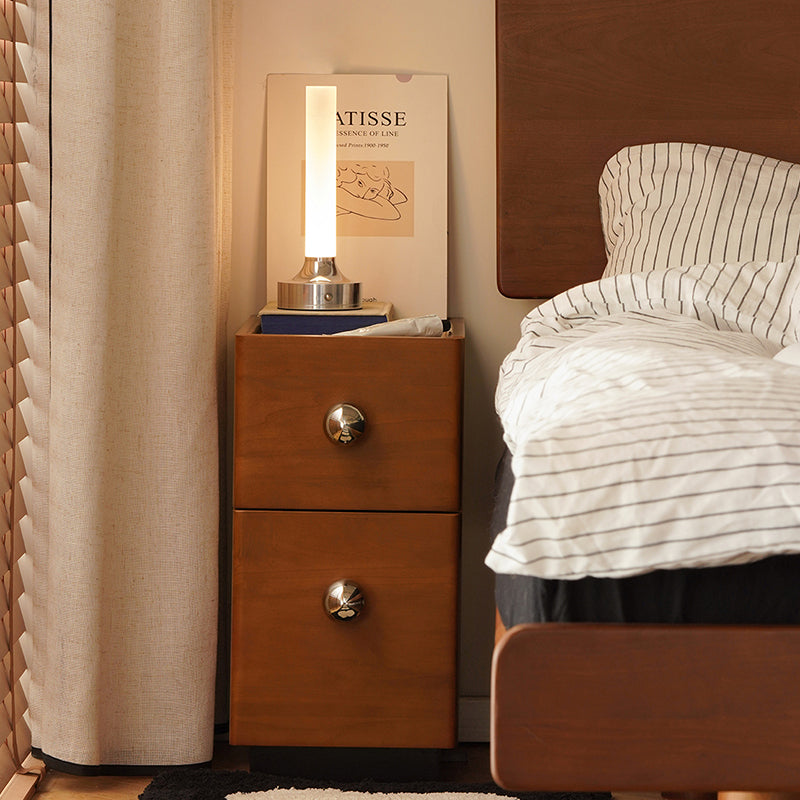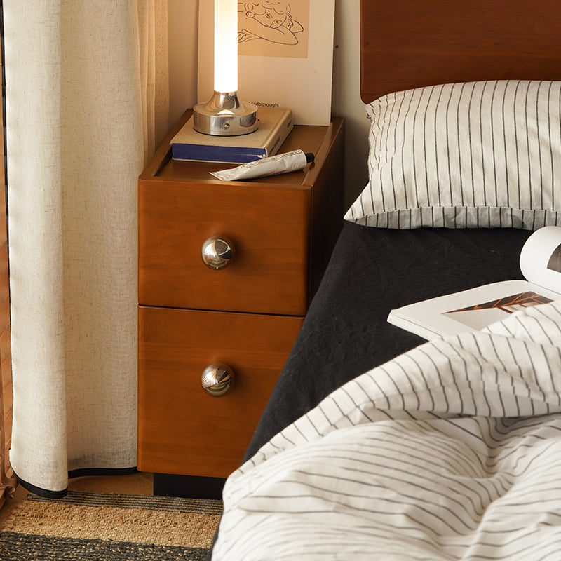 This traditional vintage nightstand features a sturdy solid wood body with stainless steel accents in a rich mid-century tone. Its rectangular silhouette with rounded ball details and a slightly raised tabletop prevents items from slipping, offering elegant two-tier storage for any bedroom.