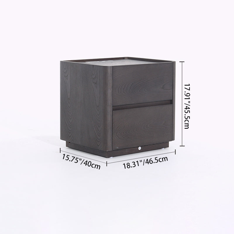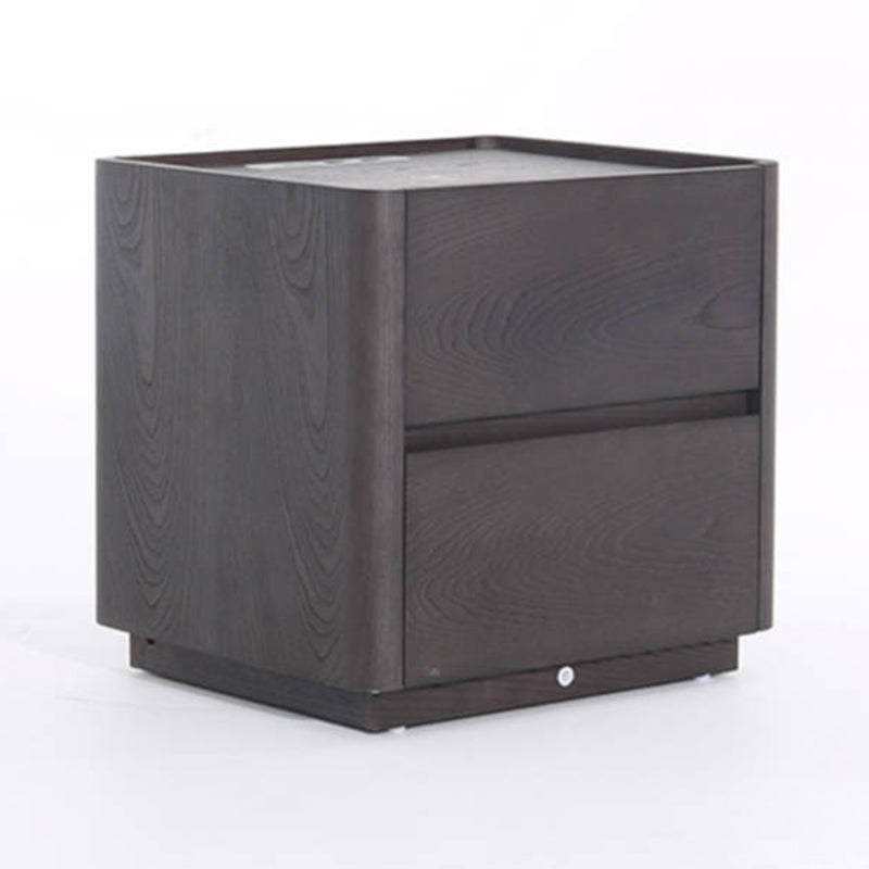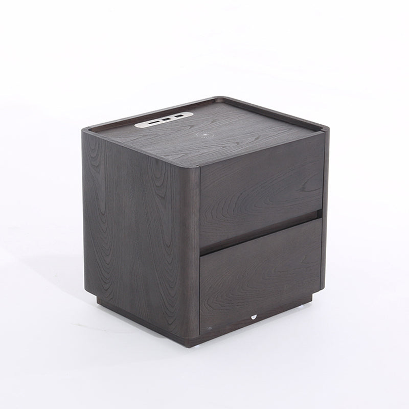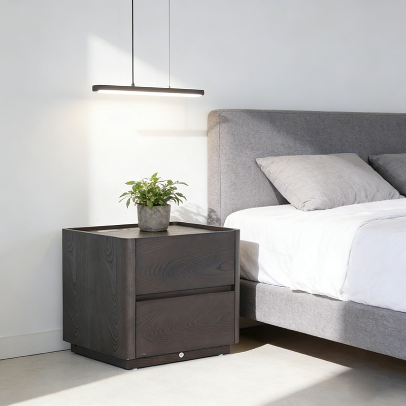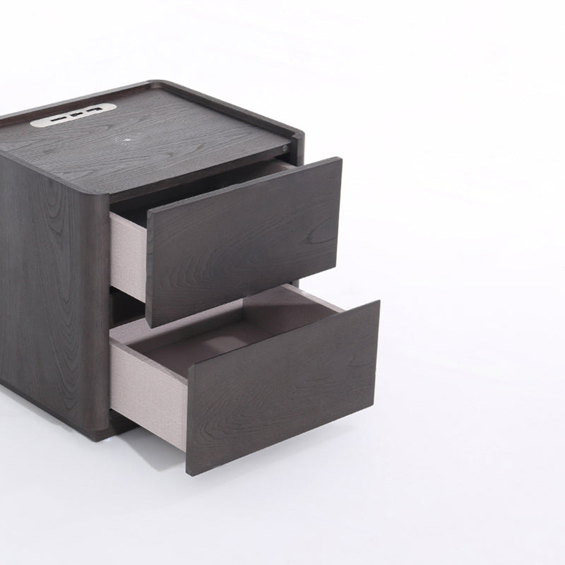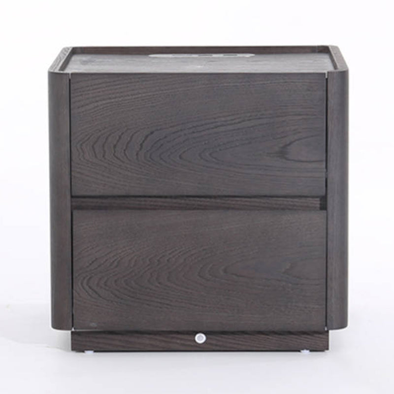 This dark wood nightstand features a rich retro grain finish crafted from veneered plywood, solid wood, and eco-friendly MDF. Clean lines and rounded edges keep the design refined, while dual hidden drawers offer practical storage. The top includes a built-in wireless charging pad and motion-sensor night light, ensuring effortless nighttime use and clutter-free charging.